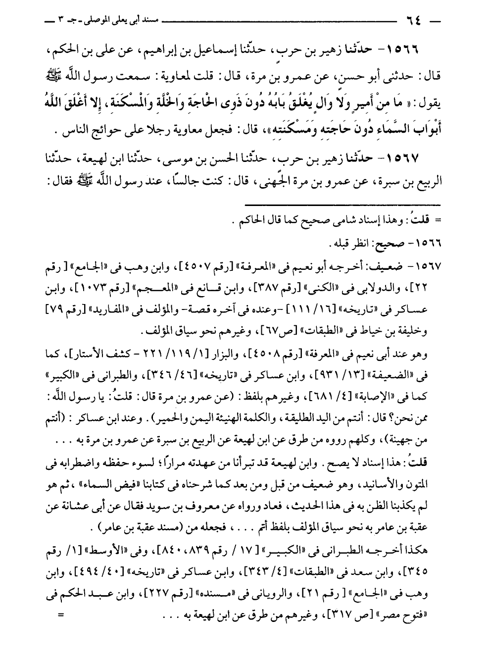 ١٥٦٦ - حدّثنا زهير بن حربٍ، حدّثنا إسماعيل بن إبراهيم، عن علي بن الحكم، قال: حدثنى أبو حسنٍ، عن عمرو بن مرة، قال: قلت لمعاوية: سمعت رسول الله - صلى الله عليه وسلم - يقول: "مَا مِنْ أَمِيرٍ وَلا وَالٍ يُغْلَقُ بَابُهُ دُونَ ذَوِى الحاجَةِ وَالخلَّةِ وَالمسْكَنَةِ، إِلا أَغْلَقَ اللهُ أَبْوَابَ السَّمَاءِ دُونَ حَاجَتِهِ وَمَسْكَنَتِهِ"، قال: فجعل معاوية رجلا على حوائج الناس.