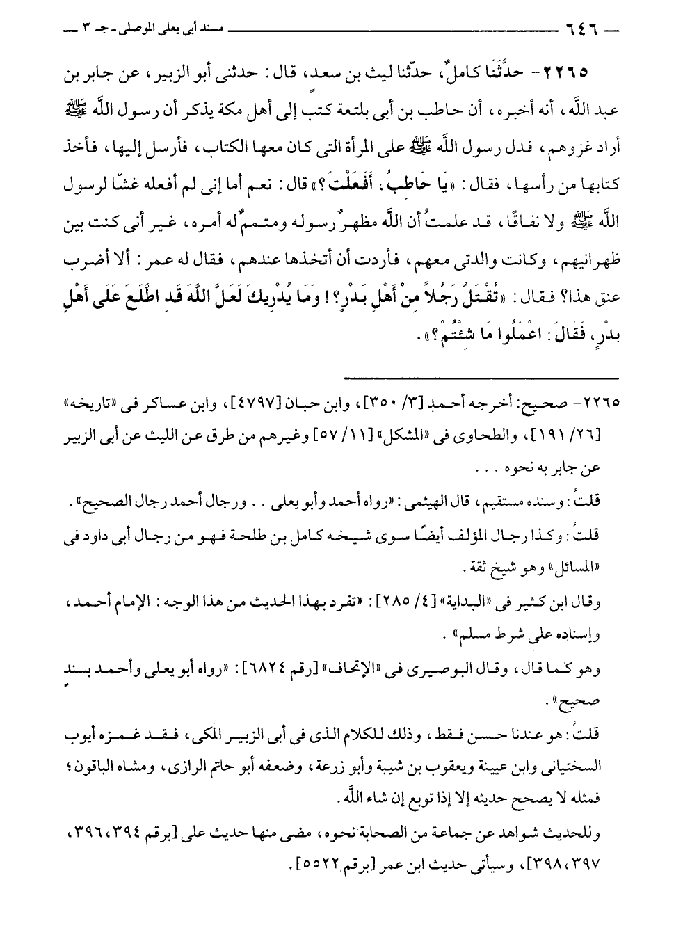 ٢٢٦٥ - حدَّثَنَا كامل، حَدَّثَنَا ليث بن سعدٍ، قال: حدثنى أبو الزبير، عن جابر بن عبد الله، أنه أخبره، أن حاطب بن أبى بلتعة كتب إلى أهل مكة يذكر أن رسول الله - صلى الله عليه وسلم - أراد غزوهم، فدل رسول الله - صلى الله عليه وسلم - على المرأة التى كان معها الكتاب، فأرسل إليها، فأخذ كتابها من رأسها، فقال: "يَا حَاطِبُ، أَفَعَلْتَ؟ " قال: نعم أما إنى لم أفعله غشّا لرسول الله - صلى الله عليه وسلم - ولا نفاقًا، قد علمتُ أن الله مظهرٌ رسوله ومتممٌ له أمره، غير أنى كنت بين ظهرانيهم، وكانت والدتى معهم، فأردت أن أتخذها عندهم، فقال له عمر: ألا أضرب عنق هذا؟ فقال: "تقْتَل رَجُلًا مِنْ أَهْلِ بَدْرٍ؟! وَمَا يُدْرِيكَ لَعَلَّ اللَّهَ قَدِ اطَّلَعَ عَلَى أَهْلِ بدْرٍ، فَقَالَ: اعْمَلُوا مَا شِئْتُمْ؟ ".