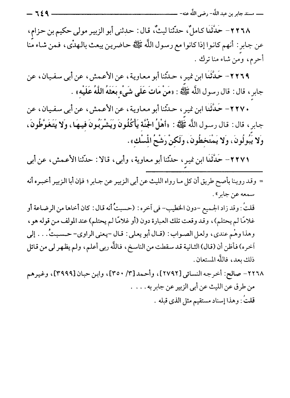 ٢٢٦٩ - حَدَّثنَا ابن نمير، حَدَّثَنَا أبو معاوية، عن الأعمش، عن أبى سفيان، عن جابرٍ، قال: قال رسول الله - صلى الله عليه وسلم -: "مَنْ مَاتَ عَلَى شَىْءٍ بَعَثَهُ اللَّهُ عَلَيْهِ".