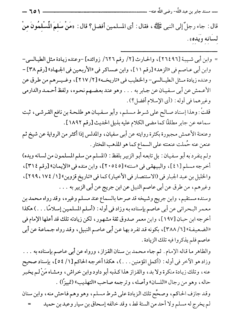 وسنده مستقيم، وابن جريج وشيخه قد صرحا بالسماع عند مسلم وغيره، وقد رواه محمد بن معمر البحرانى عن أبي عاصم بإسناده به وزاد في أوله: (أسلم المسلمين إسلامًا ... ) هكذا أخرجه ابن حبان [١٩٧]، وابن معمر صدوق ثقة مشهور، لكن زيادته تلك قد أعلها الإمام في "الضعيفة" [٦/ ٣٨٨]، بكونه قد تفرد بها عن أبى عاصم النبيل، وقد رواه جماعة عن أبى عاصم فلم يذكروا فيه تلك الزيادة.