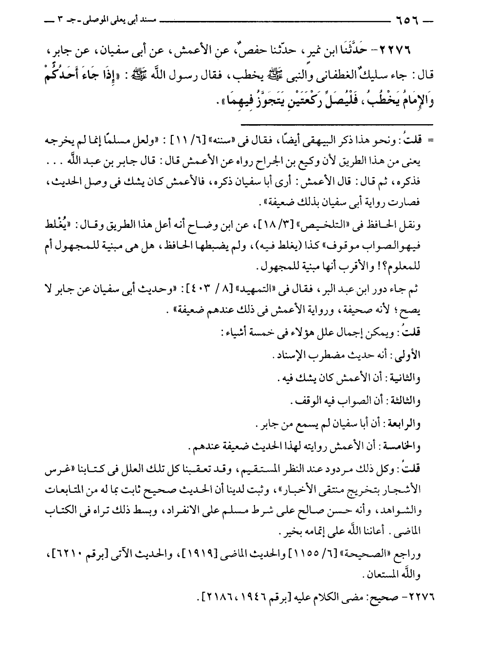 ٢٢٧٦ - حَدَّثَنَا ابن نميرٍ، حَدَّثَنَا حفصٌ، في الأعمش، عن أبى سفيان، عن جابر، قال: جاء سليكٌ الغطفانى والنبى - صلى الله عليه وسلم - يخطب، فقال رسول الله - صلى الله عليه وسلم -: "إِذَا جَاءَ أَحَدُكُمْ وَالإِمَامُ يَخْطُبُ، فَلْيُصَلِّ رَكْعَتَيْنِ يَتَجَوَّزُ فِيهِمَا".
