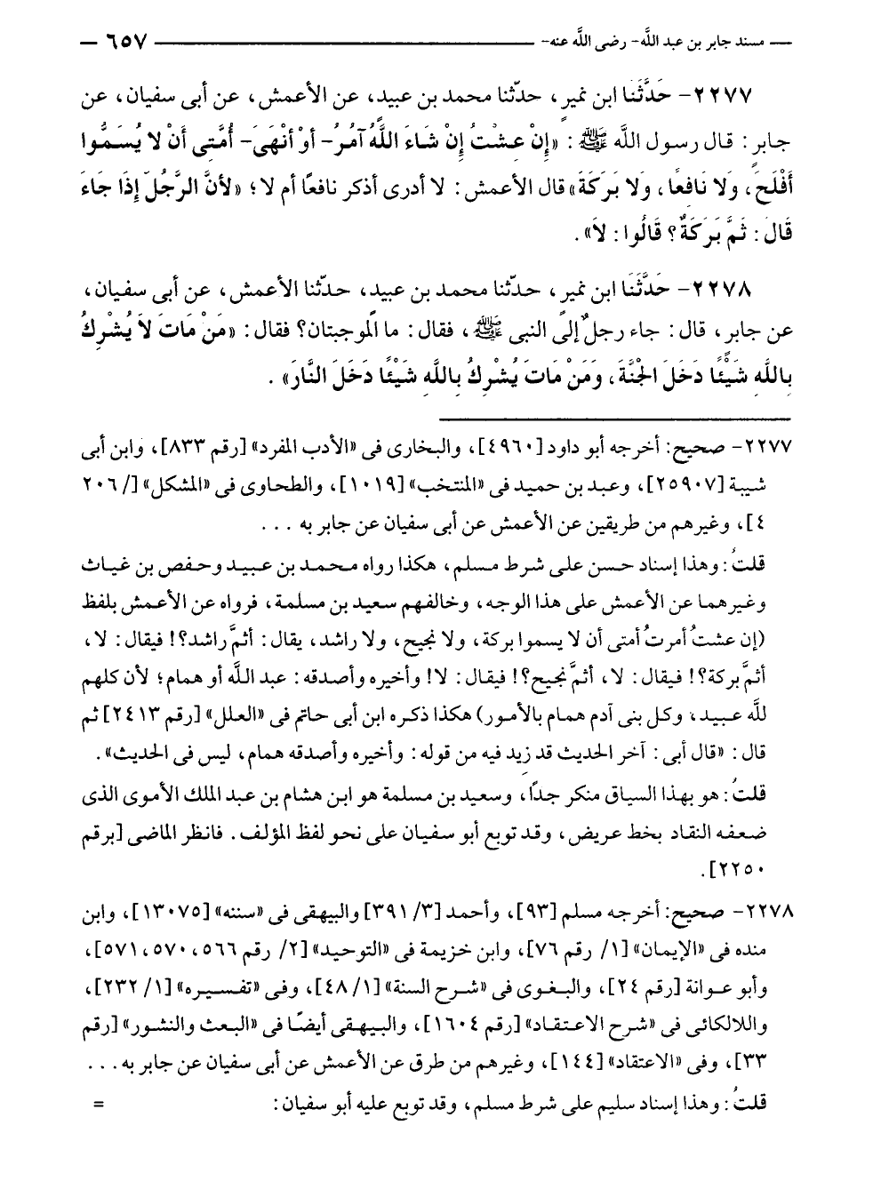 ٢٢٧٨ - حَدَّثَنَا ابن نميرٍ، حَدَّثَنَا محمد بن عبيدٍ، حَدَّثَنَا الأعمش، عن أبي سفيان، عن جابرٍ، قال: جاء رجلٌ إلى النبي - صلى الله عليه وسلم -، فقال: ما الموجبتان؟ فقال: "مَنْ مَات لَا يُشْرِكُ بِاللَّهِ شَيْئًا دَخَلَ الجَنَّةَ، وَمَنْ مَاتَ يُشْرِكُ بِاللَّهِ شَيْئًا دَخَلَ النَّارَ".