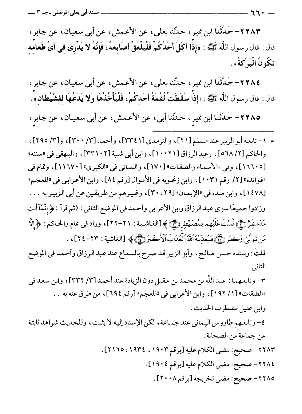 ٢٢٨٤ - حدَّثَنا ابن نميرٍ، حَدَّثَنَا يعلى، عن الأعمش، عن أبى سفيان، عن جابرٍ، قال: قال رسول الله - صلى الله عليه وسلم -: "إِذَا سَقَطَتْ لُقْمَةُ أَحَدِكُمْ، فَلْيَأْخُذْهَا وَلا يَدَعْهَا لِلشَّيْطَانِ".