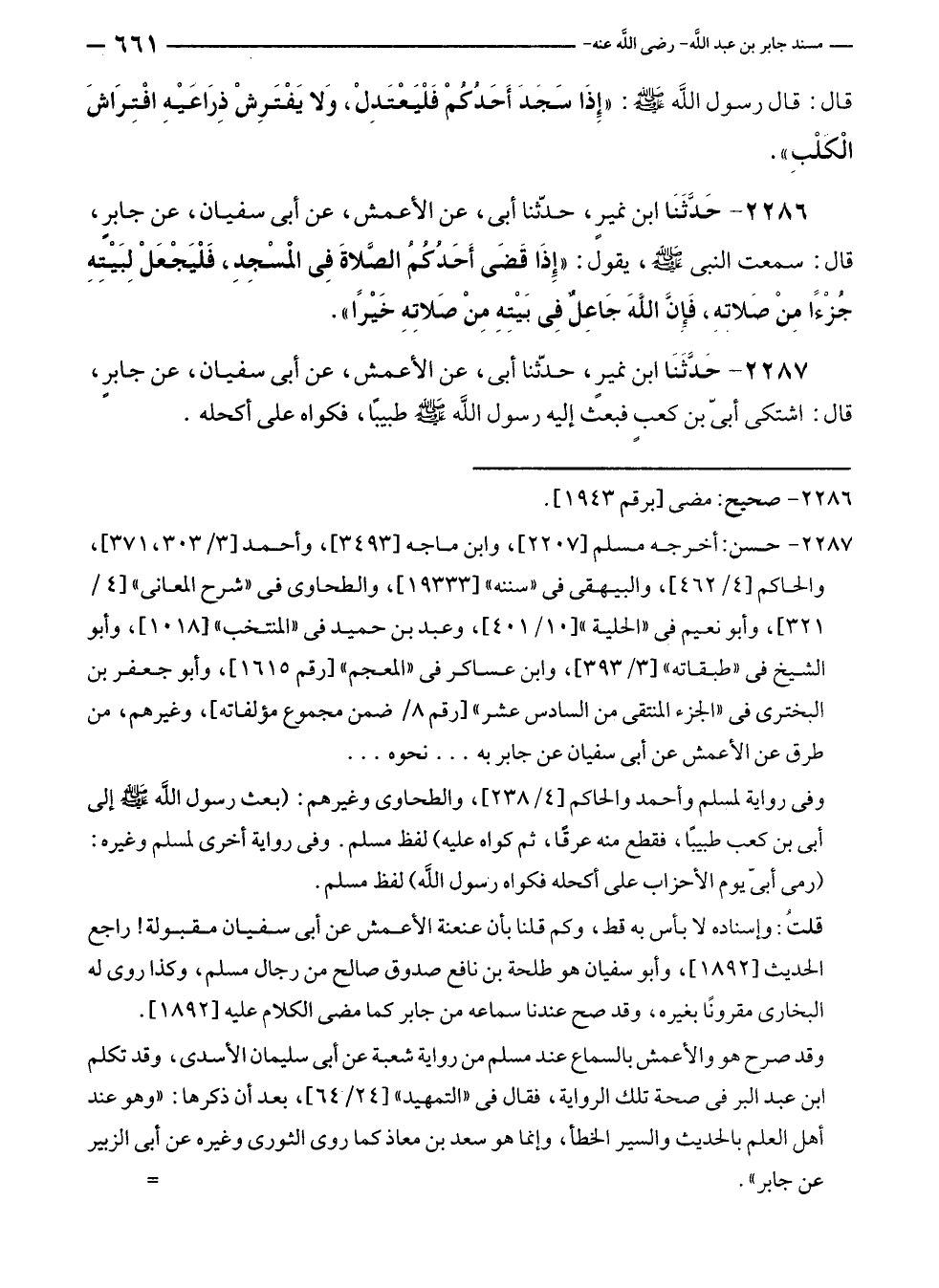 ٢٢٨٧ - حسن: أخرجه مسلم [٢٢٠٧]، وابن ماجه [٣٤٩٣]، وأحمد [٣/ ٣٠٣، ٣٧١]، والحاكم [٤/ ٤٦٢]، والبيهقى في "سننه" [١٩٣٣٣]، والطحاوى في "شرح المعانى" [٤/ ٣٢١]، وأبو نعيم في "الحلية" [١٠/ ٤٠١]، وعبد بن حميد في "المنتخب" [١٠١٨]، وأبو الشيخ في "طبقاته" [٣/ ٣٩٣]، وابن عساكر في "المعجم" [رقم ١٦١٥]، وأبو جعفر بن البخترى في "الجزء المنتقى من السادس عشر" [رقم ٨/ ضمن مجموع مؤلفاته]، وغيرهم، من طرق عن الأعمش عن أبى سفيان عن جابر به ... نحوه ...