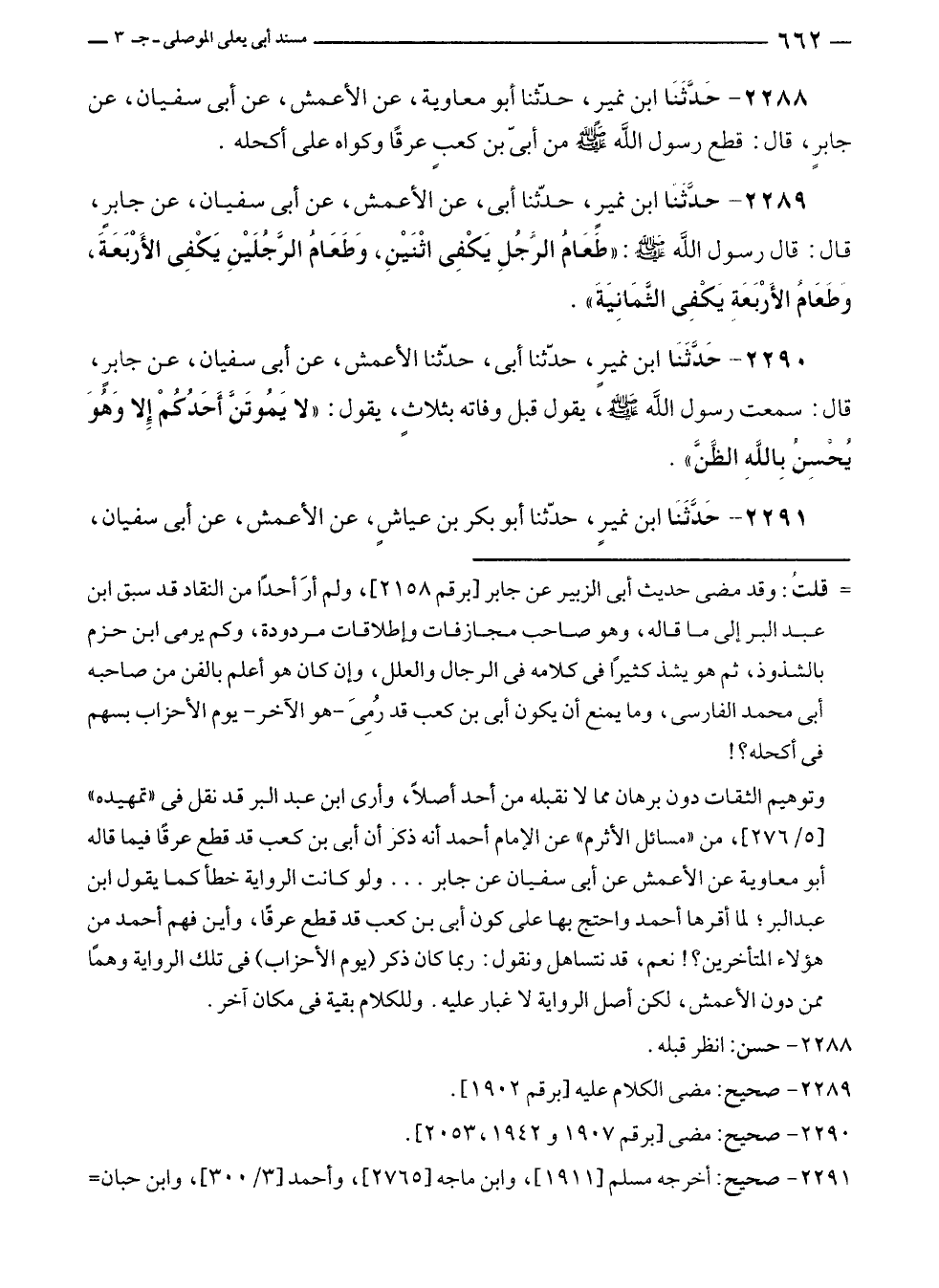 وتوهيم الثقات دون برهان مما لا نقبله من أحد أصلًا، وأرى ابن عبد البر قد نقل في "تمهيده" [٥/ ٢٧٦]، من "مسائل الأثرم" عن الإمام أحمد أنه ذكر أن أبى بن كعب قد قطع عرقًا فيما قاله أبو معاوية عن الأعمش عن أبى سفيان عن جابر ... ولو كانت الرواية خطأ كما يقول ابن عبد البر؛ لما أقرها أحمد واحتج بها على كون أبى بن كعب قد قطع عرقًا، وأين فهم أحمد من هؤلاء المتأخرين؟! نعم، قد نتساهل ونقول: ربما كان ذكر (يوم الأحزاب) في تلك الرواية وهمًا ممن دون الأعمش، لكن أصل الرواية لا غبار عليه. وللكلام بقية في مكان آخر.
