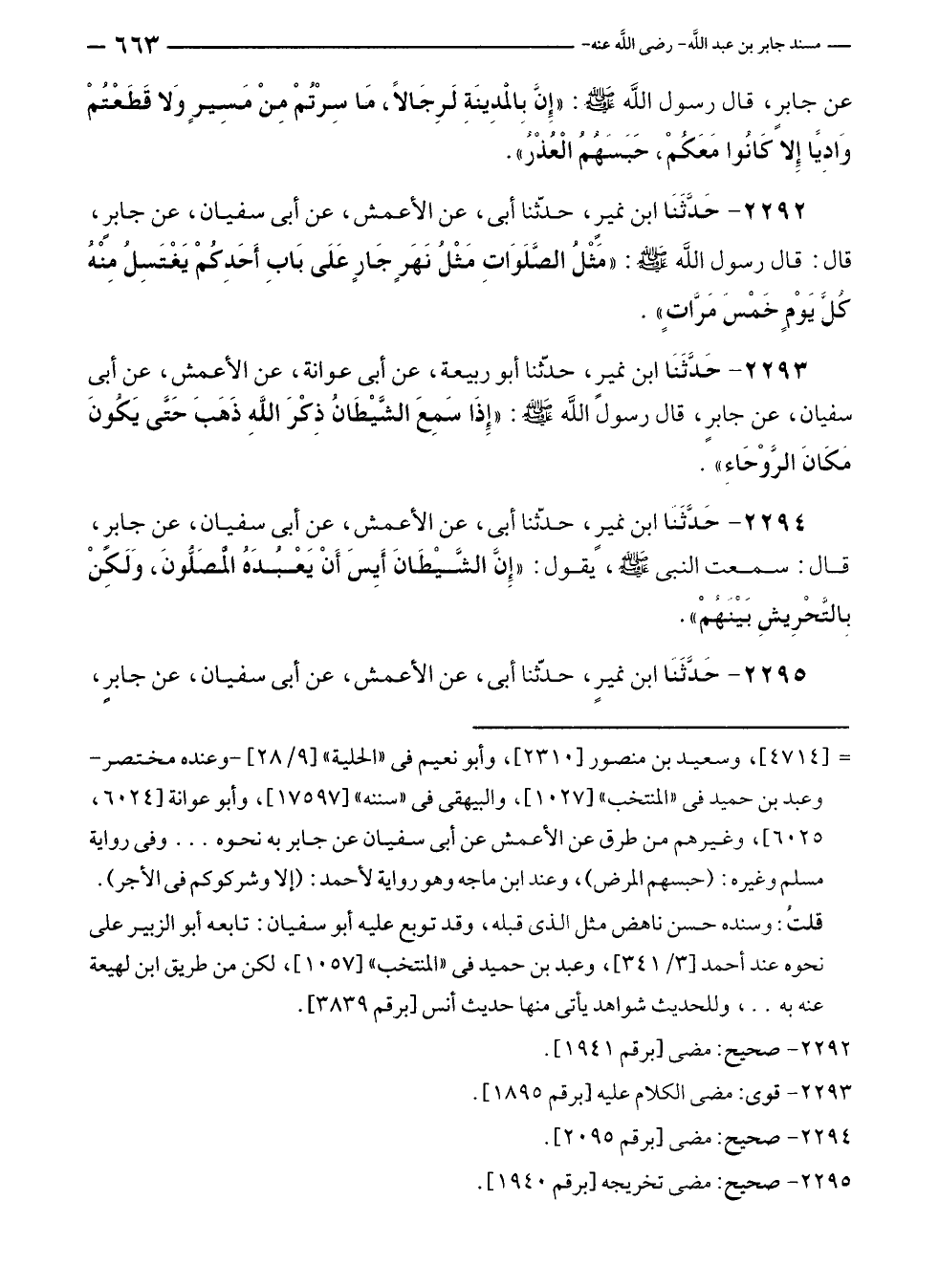 ٢٢٩٤ - حَدَّثَنَا ابن نميرٍ، حَدَّثَنَا أبى، عن الأعمش، عن أبى سفيان، عن جابرٍ، قال: سمعت النبي - صلى الله عليه وسلم -، يقول: "إِنَّ الشَّيْطَانَ أَيِسَ أَنْ يَعْبُدَهُ المَّصَلُّونَ، وَلَكِنْ بِالتَّحرِيشِ بَيْنَهمْ".