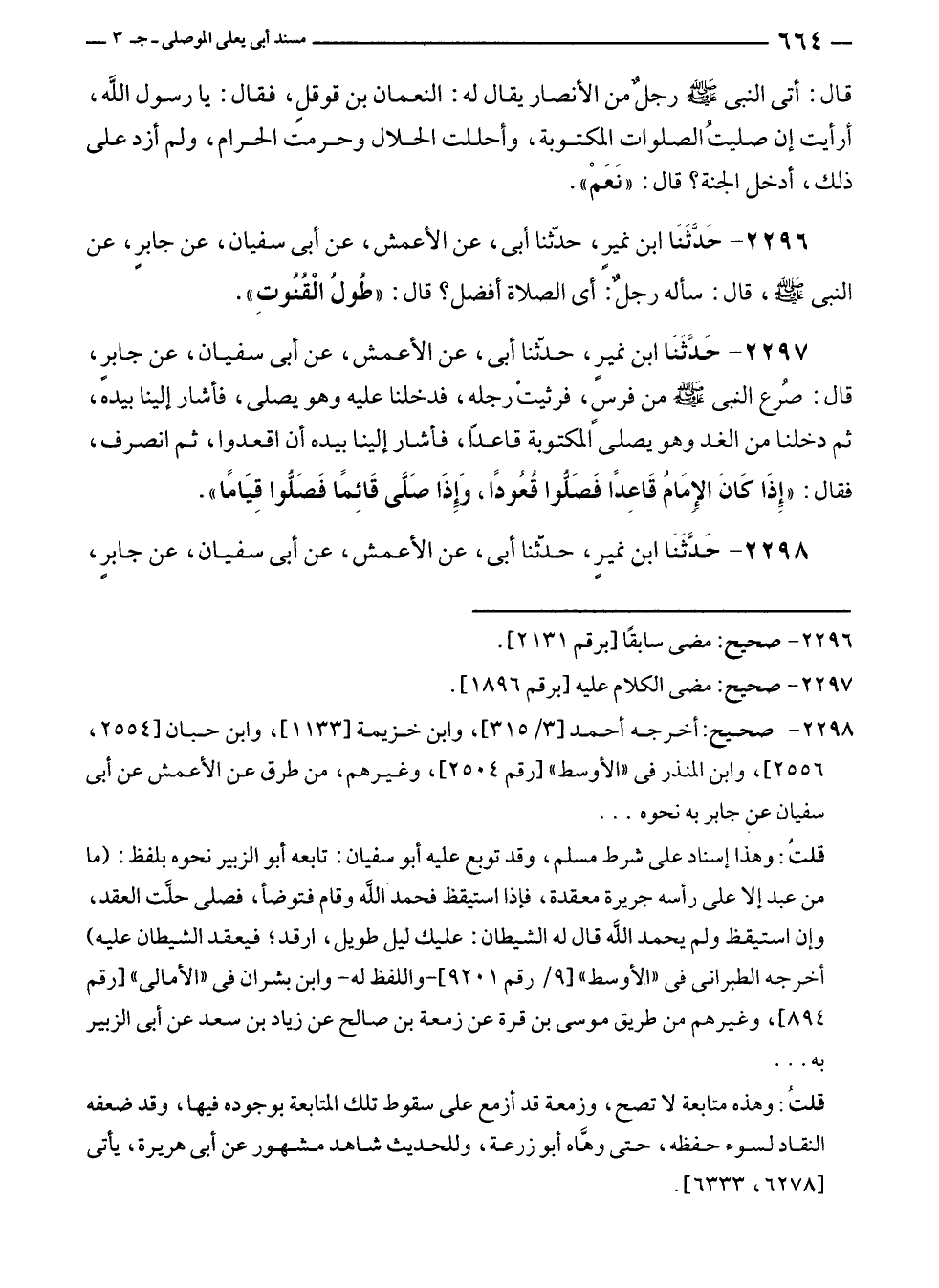 ٢٢٩٦ - حَدَّثَنَا ابن نميرٍ، حَدَّثَنَا أبى، عن الأعمش، عن أبى سفيان، عن جابر، عن النبي - صلى الله عليه وسلم -، قال: سأله رجلٌ: أي الصلاة أفضل؟ قال: "طُولُ الْقُنُوتِ".