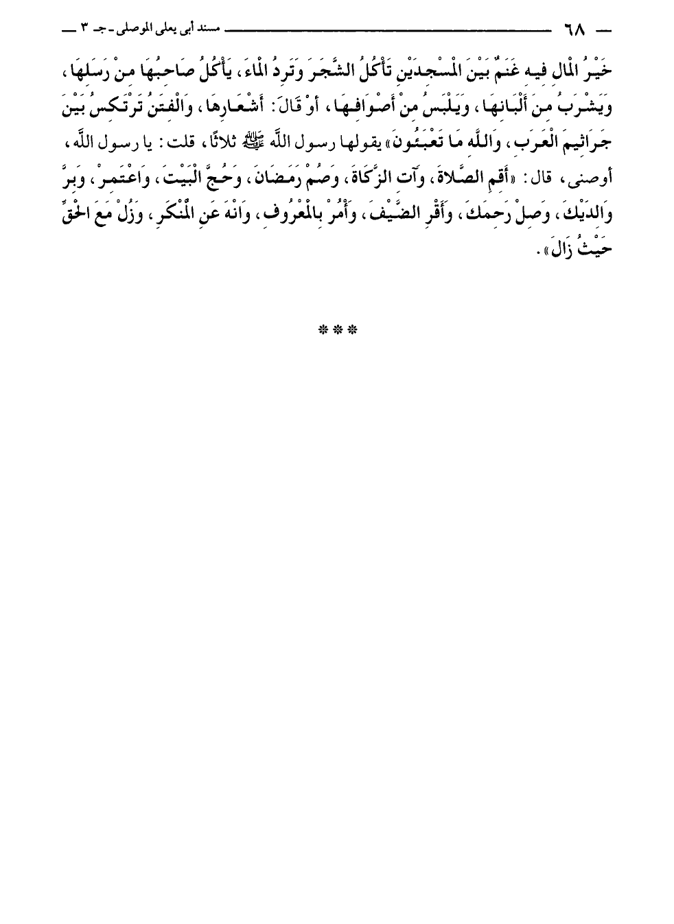 خَيْرُ المَالِ فِيهِ غَنَمٌ بَيْنَ المسْجِدَيْنِ تَأْكُلُ الشَّجَرَ وَتَرِدُ المَاءَ، يَأْكُلُ صَاحِبُهَا مِنْ رَسَلِهَا، وَيَشْرَبُ مِنَ أَلْبَانِهَا، وَيَلْبَسُ مِنْ أَصْوَافِهَا، أوْ قَالَ: أَشْعَارِهَا، وَالْفِتَنُ تَرْتَكِسُ بَيْنَ جَرَاثِيمَ الْعَرَبِ، وَاللهِ مَا تَعْبَئُونَ" يقولها رسول الله - صلى الله عليه وسلم - ثلاثًا، قلت: يا رسول الله، أوصنى، قال: "أَقِمِ الصَّلاةَ، وَآتِ الزَّكَاةَ، وَصُمْ رَمَضَانَ، وَحُجَّ الْبَيْتَ، وَاعْتَمِرْ، وَبِرَّ وَالِدَيْكَ، وَصِلْ رَحِمَكَ، وَأَقْرِ الضَّيْفَ، وَأْمُرْ بِالْمعْرُوفِ، وَانْهَ عَنِ الْمنْكَرِ، وَزُلْ مَعَ الْحقِّ حَيْثُ زَالَ".