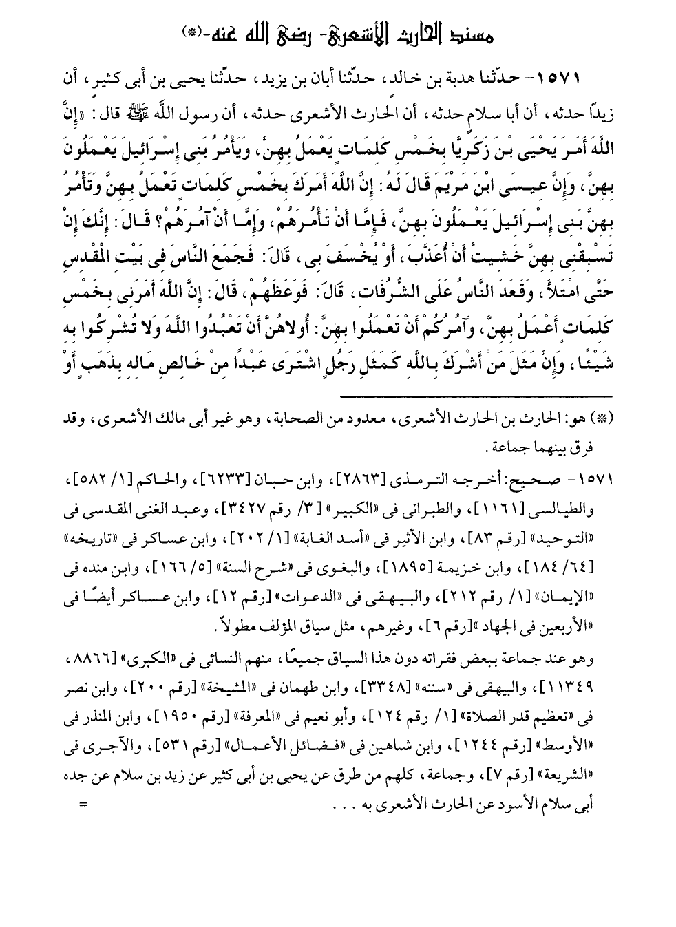 ١٥٧١ - حدّثنا هدبة بن خالدٍ، حدّثنا أبان بن يزيد، حدّثنا يحيى بن أبى كثيرٍ، أن زيدًا حدثه، أن أبا سلامٍ حدثه، أن الحارث الأشعرى حدثه، أن رسول الله - صلى الله عليه وسلم - قال: "إِنَّ اللهَ أَمَرَ يَحْيَى بْنَ زَكَرِيَّا بِخَمْسِ كَلِمَاتٍ يَعْمَلُ بِهِنَّ، وَيَأْمُرُ بَنِى إِسْرَائِيلَ يَعْمَلُونَ بِهِنَّ، وَإِنَّ عِيسَى ابْنَ مَرْيَمَ قَالَ لَهُ: إِنَّ اللهَ أَمَرَكَ بِخَمْسِ كَلِمَاتٍ تَعْمَلُ بِهِنَّ وَتَأْمُرُ بِهِنَّ بَنِى إِسْرَائِيلَ يَعْمَلُونَ بِهِنَّ، فَإِمَّا أَنْ تَأْمُرَهُمْ، وَإِمَّا أَنْ آمُرَهُمْ؟ قَالَ: إِنَّكَ إِنْ تَسْبِقْنِى بِهِنَّ خَشِيتُ أَنْ أُعَذَّبَ، أَوْ يُخْسَفَ بِى، قَالَ: فَجَمَعَ النَّاسَ فِي بَيْتِ المقْدِسِ حَتَّى امْتَلأَ، وَقَعَدَ النَّاسُ عَلَى الشُّرُفَاتِ، قَالَ: فَوَعَظَهُمْ، قَالَ: إِنَّ اللهَ أَمَرَنِى بِخَمْسِ كَلِمَاتٍ أَعْمَلُ بِهِنَّ، وَآمُرُكُمْ أَنْ تَعْمَلُوا بِهِنَّ: أُولاهُنَّ أَنْ تَعْبُدُوا اللهَ وَلا تُشْرِكُوا بِهِ شَيْئًا، وَإِنَّ مَثَلَ مَنْ أَشْرَكَ بِاللهِ كمَثَلِ رَجُلٍ اشْتَرَى عَبْدًا مِنْ خَالِصِ مَالِهِ بِذَهَبٍ أَوْ