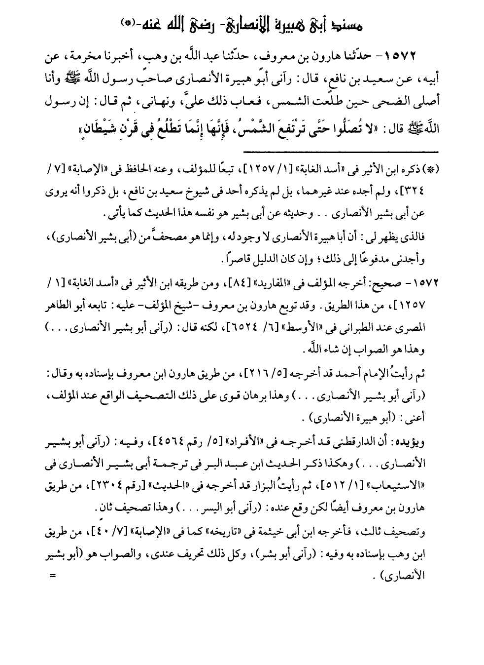 ١٥٧٢ - حدّثنا هارون بن معروفٍ، حدّثنا عبد الله بن وهبٍ، أخبرنا مخرمة، عن أبيه، عن سعيد بن نافعٍ، قال: رآنى أبو هبيرة الأنصارى صاحب رسول الله - صلى الله عليه وسلم - وأنا أصلى الضحى حين طلعت الشمس، فعاب ذلك عليَّ، ونهانى، ثم قال: إن رسول الله - صلى الله عليه وسلم - قال: "لا تصَلُّوا حَتَّى تَرْتَفِعَ الشَّمْسُ، فَإِنَّهَا إِنَّمَا تَطْلُعُ فِي قَرْنِ شَيْطَانٍ".