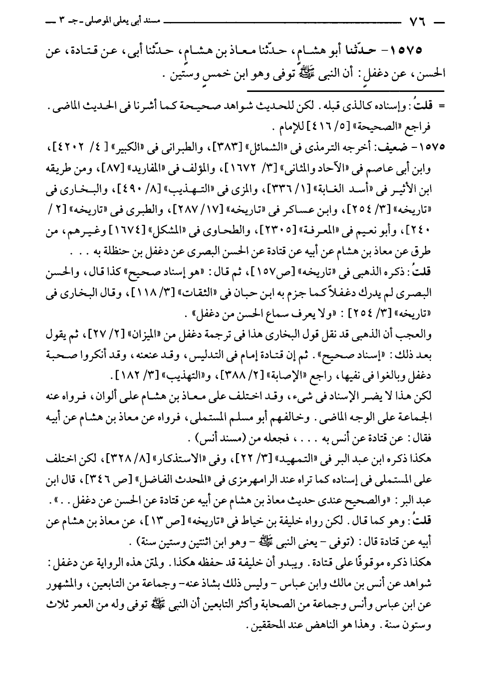 ١٥٧٥ - حدّثنا أبو هشامٍ، حدّثنا معاذ بن هشامٍ، حدّثنا أبى، عن قتادة، عن الحسن، عن دغفلٍ: أن النبي - صلى الله عليه وسلم - توفى وهو ابن خمسٍ وستين.