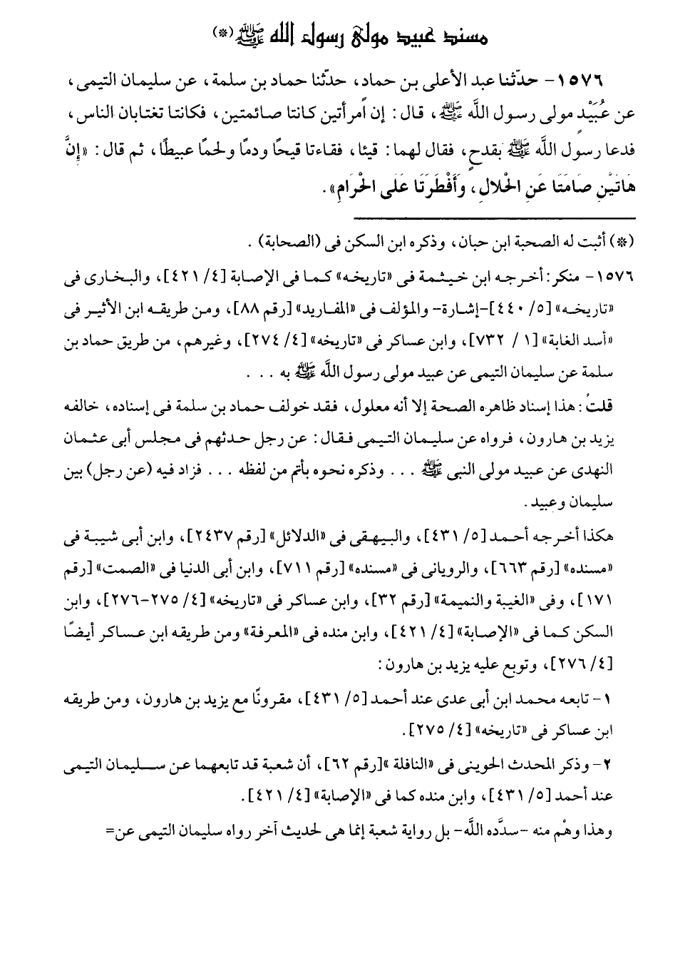 ١٥٧٦ - حدّثنا عبد الأعلى بن حمادٍ، حدّثنا حماد بن سلمة، عن سليمان التيمى، عن عُبَيْدٍ مولى رسول الله - صلى الله عليه وسلم -، قال: إن امرأتين كانتا صائمتين، فكانتا تغتابان الناس، فدعا رسول الله - صلى الله عليه وسلم - بقدحٍ، فقال لهما: قيئا، فقاءتا قيحًا ودمًا ولحمًا عبيطًا، ثم قال: "إِنَّ هَاتَيْنِ صَامَتا عَنِ الحلالِ، وَأَفْطَرَتَا عَلى الحرامِ".
