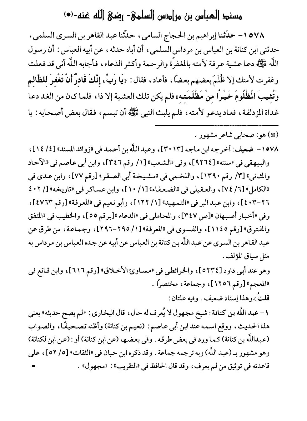 ١٥٧٨ - حدّثنا إبراهيم بن الحجاج السامى، حدّثنا عبد القاهر بن السرى السلمى، حدثنى ابن كنانة بن العباس بن مرداسٍ السلمى، أن أباه حدثه، عن أبيه العباس: أن رسول الله - صلى الله عليه وسلم - دعا عشية عرفة لأمته بالمغفرة والرحمة وأكثر الدعاء، فأجابه الله أنى قد فعلت وغفرت لأمتك إلا ظُلْمَ بعضهم بعضًا، فأعاد، فقال: "يَا رَبِّ، إِنَّكَ قَادِرٌ أَنْ تَغْفِرَ لِلظَّالِمِ وَتُثِيبَ المظْلُومَ خَيْرًا مِنْ مَظْلَمَتِهِ" فلم يكن تلك العشية إلا ذا، فلما كان من الغد دعا غداة المزدلفة، فعاد يدعو لأمته، فلم يلبث النبي - صلى الله عليه وسلم - أن تبسم، فقال بعض أصحابه: يا