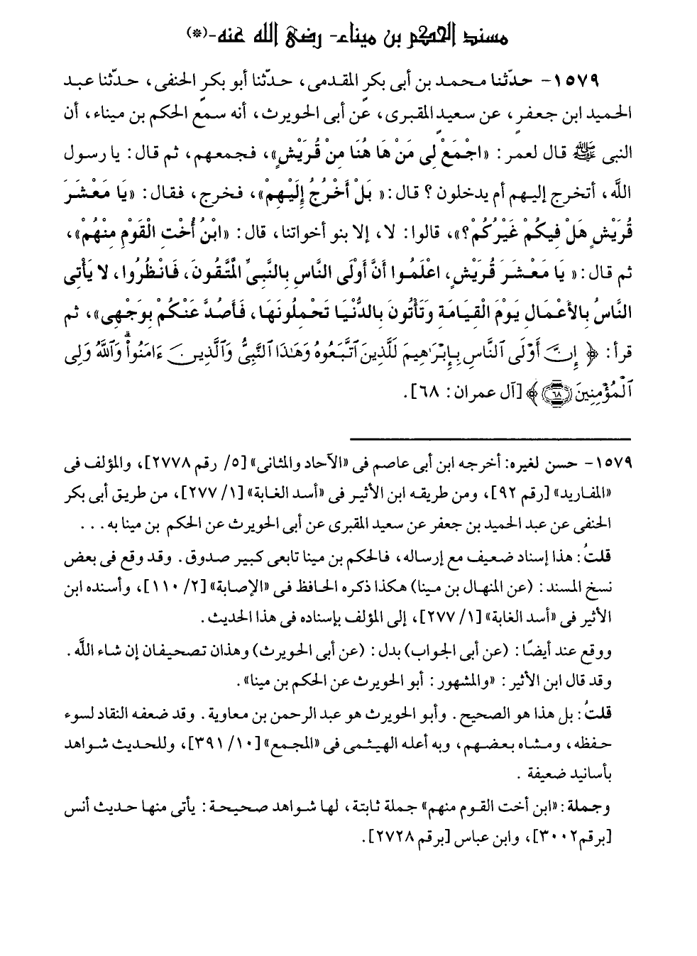 ١٥٧٩ - حدّثنا محمد بن أبى بكرٍ المقدمى، حدّثنا أبو بكر الحنفى، حدّثنا عبد الحميد بن جعفرٍ، عن سعيد المقبرى، عن أبى الحويرث، أنه سمع الحكم بن ميناء، أن النبي - صلى الله عليه وسلم - قال لعمر: "اجْمَعْ لِي مَنْ هَا هُنَا مِنْ قُرَيْشٍ"، فجمعهم، ثم قال: يا رسول الله، أتخرج إليهم أم يدخلون؟ قال: "بَلْ أَخْرُجُ إِلَيْهِمْ"، فخرج، فقال: "يَا مَعْشَرَ قُرَيْشٍ هَلْ فِيكُمْ غَيْرُكُمْ؟ "، قالوا: لا، إلا بنو أخواتنا، قال: "ابْن اخْتِ الْقَوْمِ مِنْهُمْ"، ثم قال: "يَا مَعْشَرَ قُرَيْشٍ، اعْلَمُوا أَنَّ أَوْلَى النَّاسِ بِالنَّبِيِّ الْمتَّقونَ، فَانْظُرُوا، لا يَأْتِى النَّاسُ بِالأَعْمَالِ يَوْمَ الْقِيَامَةِ وَتَأْتُونَ بِالدُّنْيَا تَحْمِلُونَهَا، فَأَصُدَّ عَنْكُمْ بِوَجْهِى"، ثم قرأ: {إِنَّ أَوْلَى النَّاسِ بِإِبْرَاهِيمَ لَلَّذِينَ اتَّبَعُوهُ وَهَذَا النَّبِيُّ وَالَّذِينَ آمَنُوا وَاللَّهُ وَلِيُّ الْمُؤْمِنِينَ (٦٨)} [آل عمران: ٦٨].