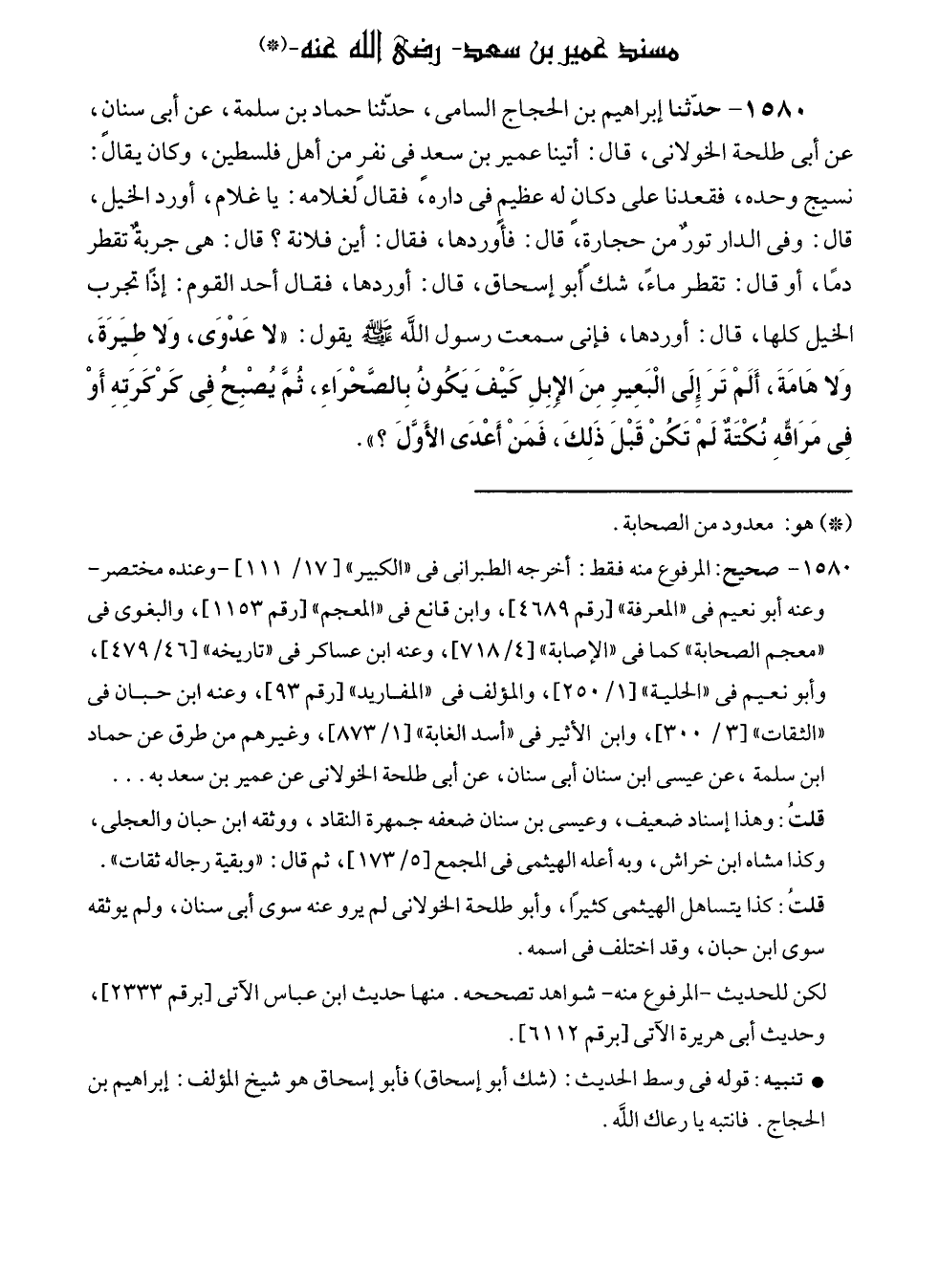١٥٨٠ - حدّثنا إبراهيم بن الحجاج السامى، حدّثنا حماد بن سلمة، عن أبى سنانٍ، عن أبى طلحة الخولانى، قال: أتينا عمير بن سعدٍ في نفرٍ من أهل فلسطين، وكان يقال: نسيج وحده، فقعدنا على دكانٍ له عظيمٍ في داره، فقال لغلامه: يا غلام، أورد الخيل، قال: وفى الدار تورٌ من حجارةٍ، قال: فأوردها، فقال: أين فلانة؟ قال: هي جربةٌ تقطر دمًا، أو قال: تقطر ماءً، شك أبو إسحاق، قال: أوردها، فقال أحد القوم: إذًا تجرب الخيل كلها، قال: أوردها، فإنى سمعت رسول الله - صلى الله عليه وسلم - يقول: "لا عَدْوَى، وَلا طِيَرَةَ، وَلا هَامَةَ، أَلَمْ تَرَ إِلَى الْبَعِيرِ مِنَ الإِبِلِ كيْفَ يَكُونُ بِالصَّحْرَاءِ، ثُمَ يُصْبِحُ فِي كرْكَرَتِهِ أَوْ فِي مَرَاقِّهِ نُكْتَةٌ لَمْ تَكُنْ قَبْلَ ذَلِكَ، فَمَنْ أَعْدَى الأَوَّلَ؟ ".