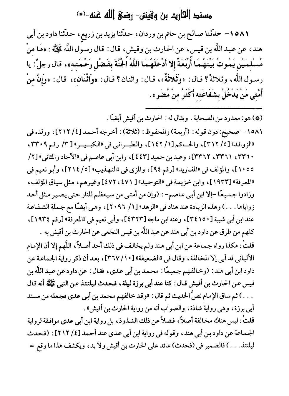 ١٥٨١ - حدّثنا صالح بن حاتم بن وردان، حدّثنا يزيد بن زريعٍ، حدّثنا داود بن أبى هند، عن عبد الله بن قيسٍ، عن الحارث بن وقيشٍ، قال: قال رسول الله - صلى الله عليه وسلم -: "مَا مِنْ مُسْلِمَيْنِ يَمُوتُ بَيْنَهُمَا أَرْبَعَةٌ إِلا أَدْخَلَهُمَا اللهُ الْجَنَّةَ بِفَضْلِ رَحْمَتِهِ"، قال رجلٌ: يا رسول الله، وثلاثةٌ؟ قال: "وَثَلاثَةٌ"، قال: واثنان؟ قال: "وَاثْنَانِ"، قال: "وَإنَّ مِنْ أُمَّتِى مَنْ يَدْخل بِشَفَاعَتِهِ أَكْثَرُ مِنْ مُضَر".
