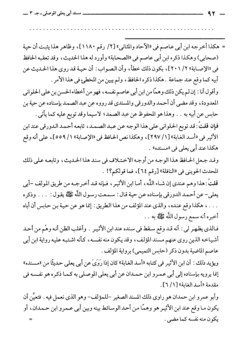 قلتُ: هذا وهم عندى إن شاء الله، أما ابن الأثير، فإنه قد أخرجه من طريق المولف - أبى يعلى - عن أحمد الدورقى بإسناده عن حية قال: سمعت رسول الله - صلى الله عليه وسلم - يقول: ... وذكره ... ، هكذا وقع عنده، والذى عند المؤلف من هذا الطريق: إنما هو عن حية بن حابس أن أباه أخبره أنه سمع رسول الله - صلى الله عليه وسلم - به ..