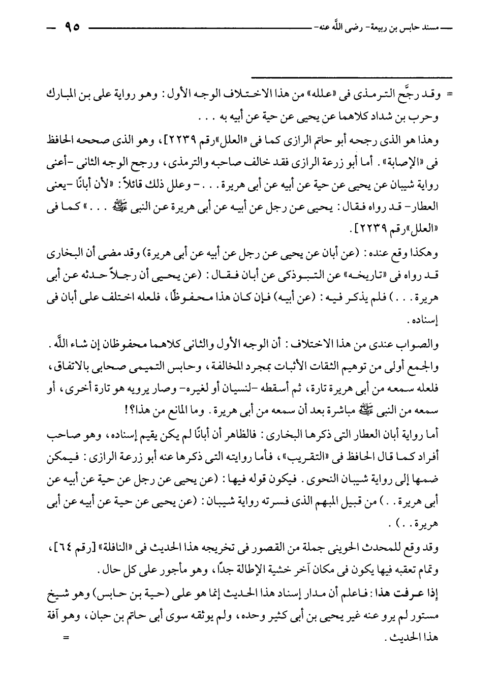 وهذا هو الذي رجحه أبو حاتم الرازى كما في "العلل" رقم ٢٢٣٩]، وهو الذي صححه الحافظ في "الإصابة". أما أبو زرعة الرازى فقد خالف صاحبه والترمذى، ورجح الوجه الثاني - أعنى رواية شيبان عن يحيى عن حية عن أبيه عن أبى هريرة ... - وعلل ذلك قائلًا: "لأن أبانًا - يعنى العطار - قد رواه فقال: يحيى عن رجل عن أبيه عن أبى هريرة عن النبي - صلى الله عليه وسلم - ... " كما في "العلل" رقم ٢٢٣٩].