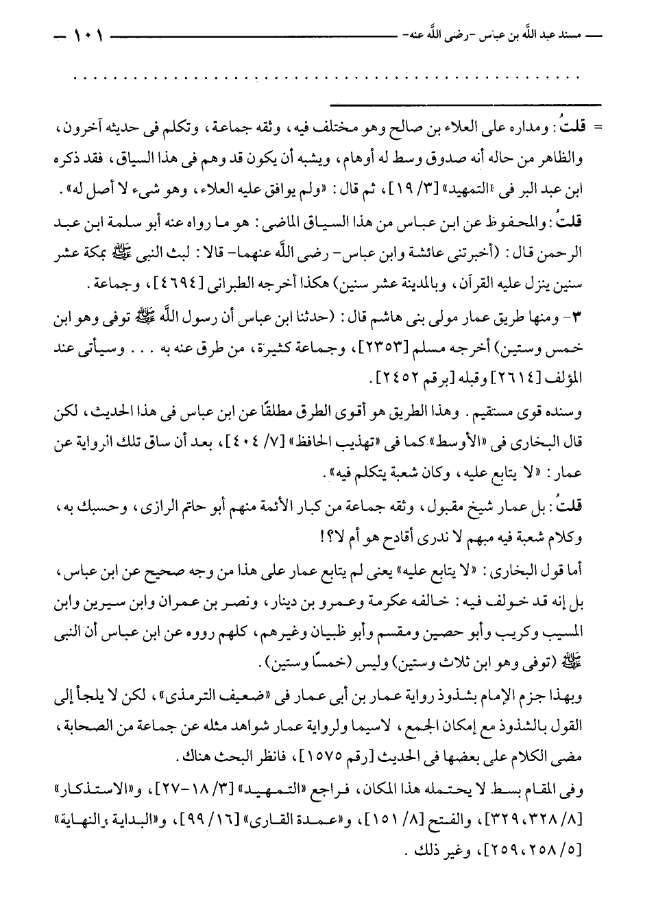 وسنده قوى مستقيم. وهذا الطريق هو أقوى الطرق مطلقًا عن ابن عباس في هذا الحديث، لكن قال البخارى في "الأوسط" كما في "تهذيب الحافظ" [٧/ ٤٠٤]، بعد أن ساق تلك الرواية عن عمار: "لا يتابع عليه، وكان شعبة يتكلم فيه".