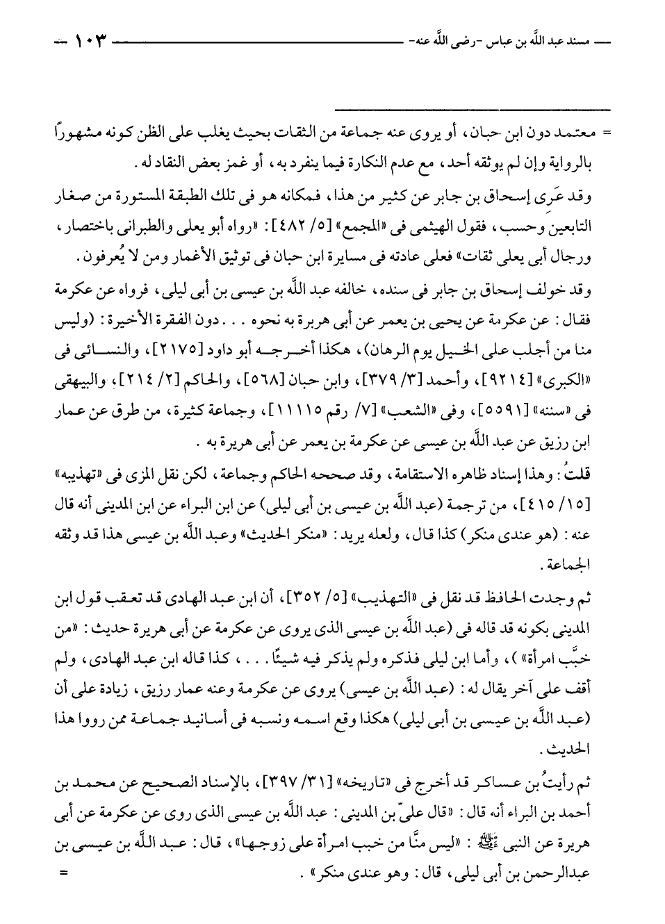 ثم وجدت الحافظ قد نقل في "التهذيب" [٥/ ٣٥٢]، أن ابن عبد الهادى قد تعقب قول ابن المدينى بكونه قد قاله في (عبد الله بن عيسى الذي يروى عن عكرمة عن أبى هريرة حديث: "من خبَّب امرأة")، وأما ابن ليلى فذكره ولم يذكر فيه شيئًا ... ، كذا قاله ابن عبد الهادى، ولم أقف على آخر يقال له: (عبد الله بن عيسى) يروى عن عكرمة وعنه عمار رزيق، زيادة على أن (عبد الله بن عيسى بن أبى ليلى) هكذا وقع اسمه ونسبه في أسانيد جماعة ممن رووا هذا الحديث.