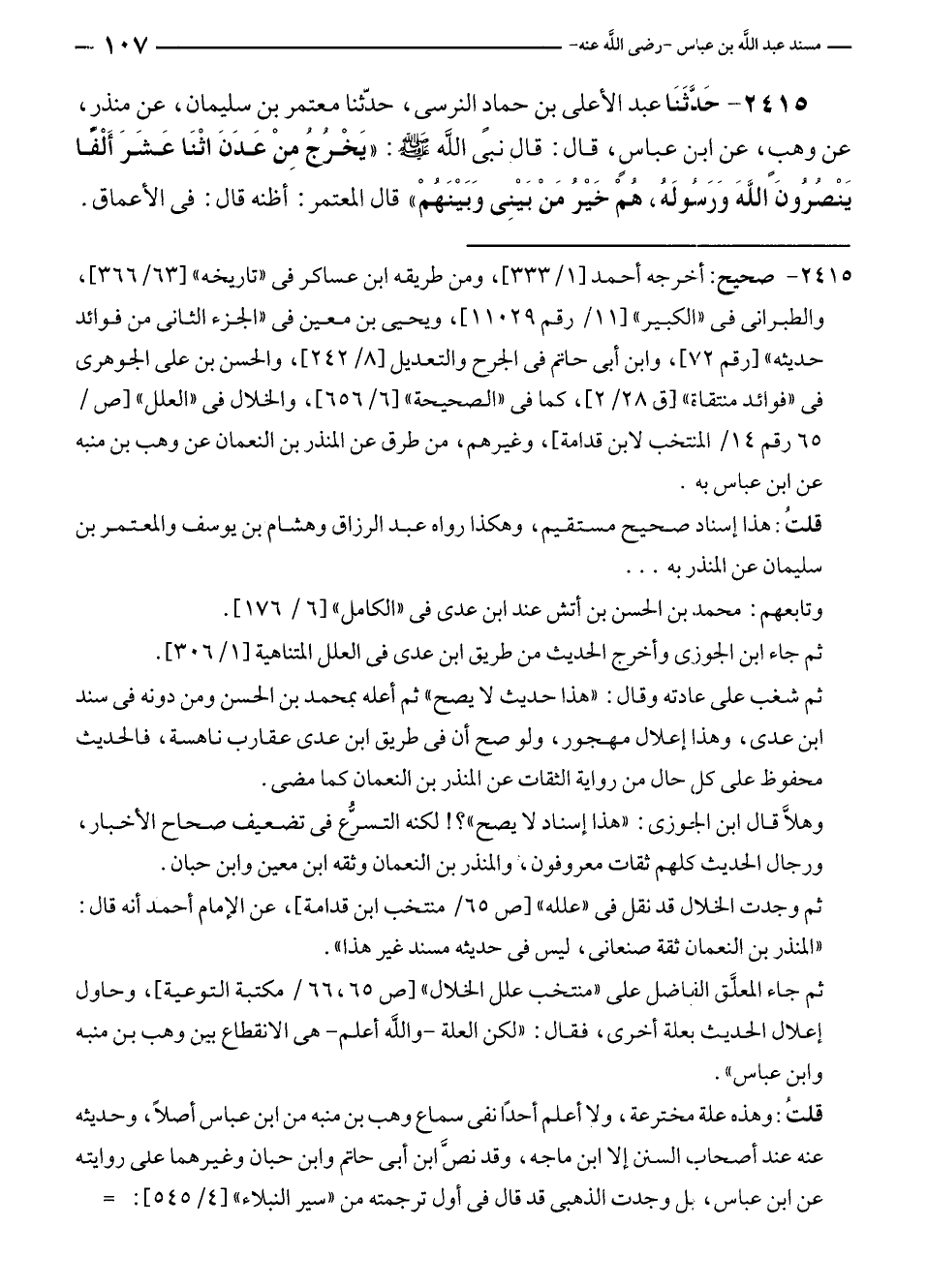 ٢٤١٥ - صحيح: أخرجه أحمد [١/ ٣٣٣]، ومن طريقه ابن عساكر في "تاريخه" [٦٣/ ٣٦٦]، والطبرانى في "الكبير" [١١/ رقم ١١٠٢٩]، ويحيى بن معين في "الجزء الثاني من فوائد حديثه" [رقم ٧٢]، وابن أبى حاتم في الجرح والتعديل [٨/ ٢٤٢]، والحسن بن على الجوهرى في "فوائد منتقاة" [ق ٢٨/ ٢]، كما في "الصحيحة" [٦/ ٦٥٦]، والخلال في "العلل" [ص/ ٦٥ رقم ١٤/ المنتخب لابن قدامة]، وغيرهم، من طرق عن المنذر بن النعمان عن وهب بن منبه عن ابن عباس به.