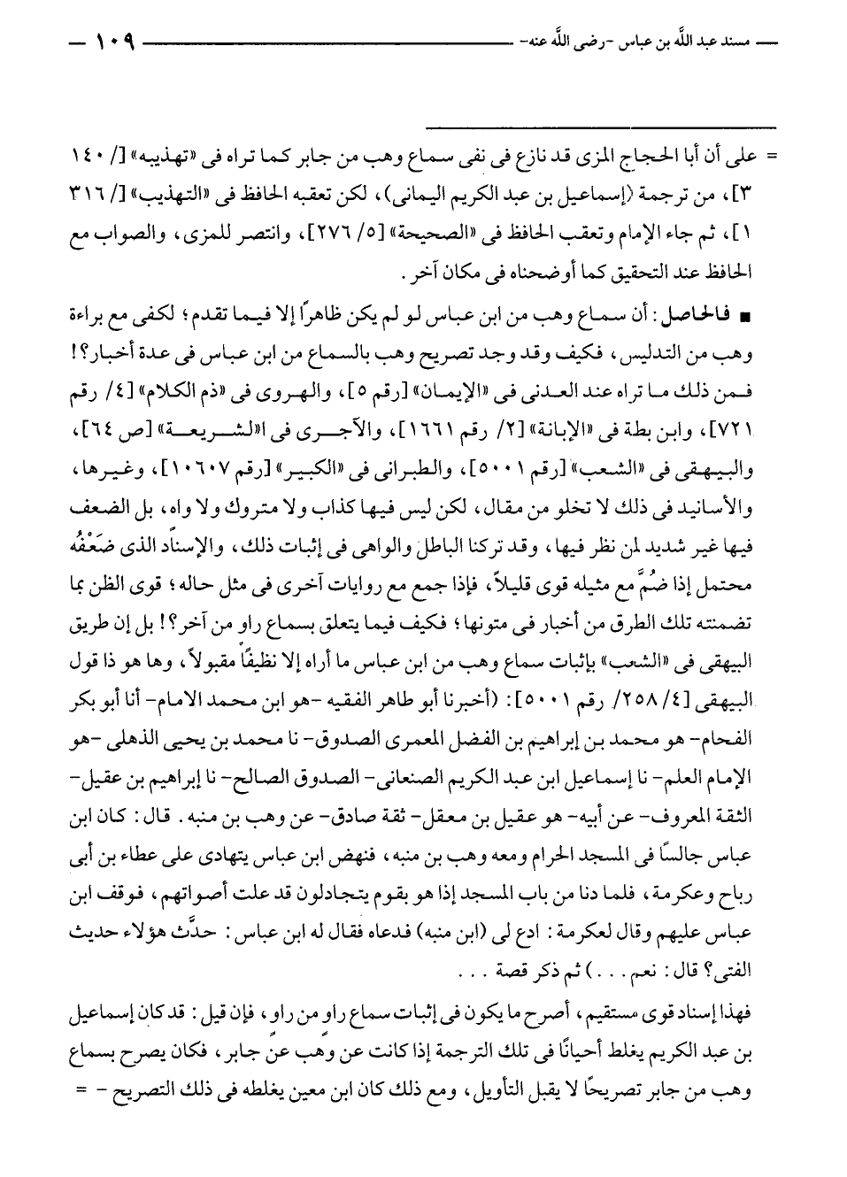 فهذا إسناد قوى مستقيم، أصرح ما يكون في إثبات سماع راو من راوٍ، فإن قيل: قد كان إسماعيل بن عبد الكريم يغلط أحيانًا في تلك الترجمة إذا كانت عن وهب عن جابر، فكان يصرح بسماع وهب من جابر تصريحًا لا يقبل التأويل، ومع ذلك كان ابن معين يغلطه في ذلك التصريح - =