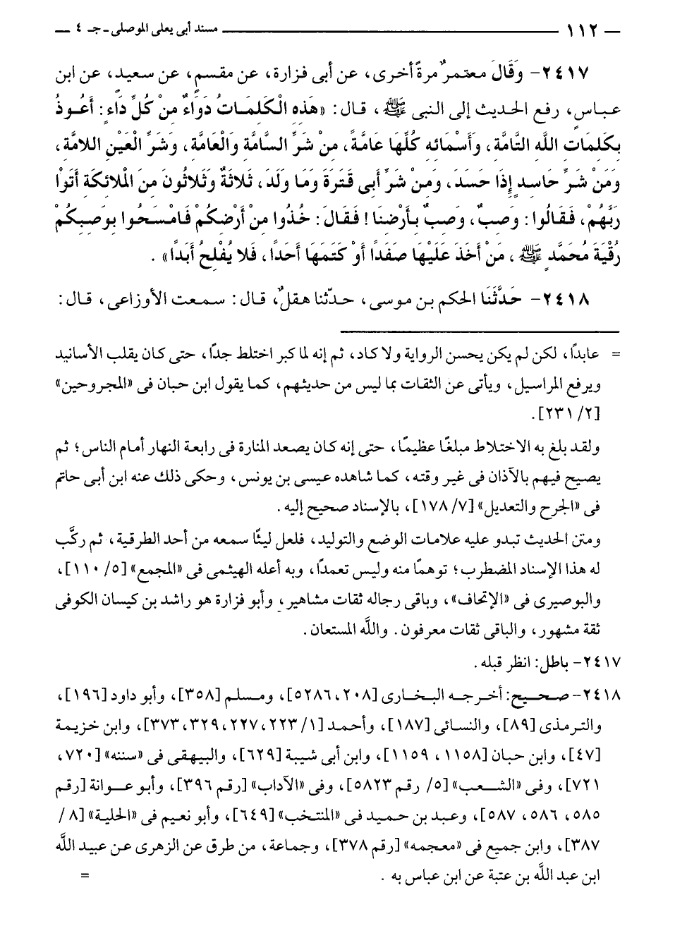 ٢٤١٧ - وَقَالَ معتمرٌ مرةً أخرى، عن أبى فزارة، عن مقسمٍ، عن سعيد، عن ابن عباسٍ، رفع الحديث إلى النبي - صلى الله عليه وسلم -، قال: "هَذِه الْكَلِمَاتُ دَوَاءٌ مِنْ كُلِّ دَاءٍ: أَعُوذُ بِكَلِمَات اللَّهِ التَّامَّةِ، وَأَسْمَائِهِ كُلِّهَا عَامَّةً، مِنْ شَرِّ السَّامَّةِ وَالْعَامَّةِ، وَشَرِّ الْعَيْنِ اللامَّةِ، وَمَنْ شَرِّ حَاسِدٍ إذَا حَسَدَ، وَمِنْ شَرِّ أَبِي قَتَرَةَ وَمَا وَلَدَ، ثَلاثَةٌ وَثَلاثُونَ مِنَ الملائكَةِ أَتَوْا رَبَّهُمْ، فَقَالُوا: وَصِبٌ، وَصِبٌ بِأَرْضنَا! فَقَالَ: خُذُوا مِنْ أَرْضِكُمْ فَامْسَحُوا بِوَصِبِكُمْ رُقْيَةَ مُحَمَّدٍ - صلى الله عليه وسلم -، مَنْ أَخَذَ عَلَيْهَا صَفَدًا أَوْ كَتَمَهَا أَحَدًا، فَلا يُفْلِحُ أَبَدًا".