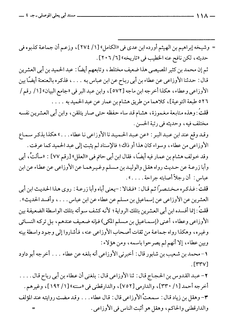 قلتُ: إنما أفسده ابن أبى العشرين بتلك الرواية؛ لأنه كشف سوأته بتلك الواسطة الضعيفة بين الأوزاعى وعطاء، أعنى (إسماعيل بن مسلم المكى) فإنه ضعيف عندهم، بل تركه النسائي وغيره، وهكذا رواه جماعة من ثقات أصحاب الأوزاعى عنه، فأشاروا إلى وجود واسطة بينه وبين عطاء، إلا أنهم لم يصرحوا باسمه، ومن هؤلاء: