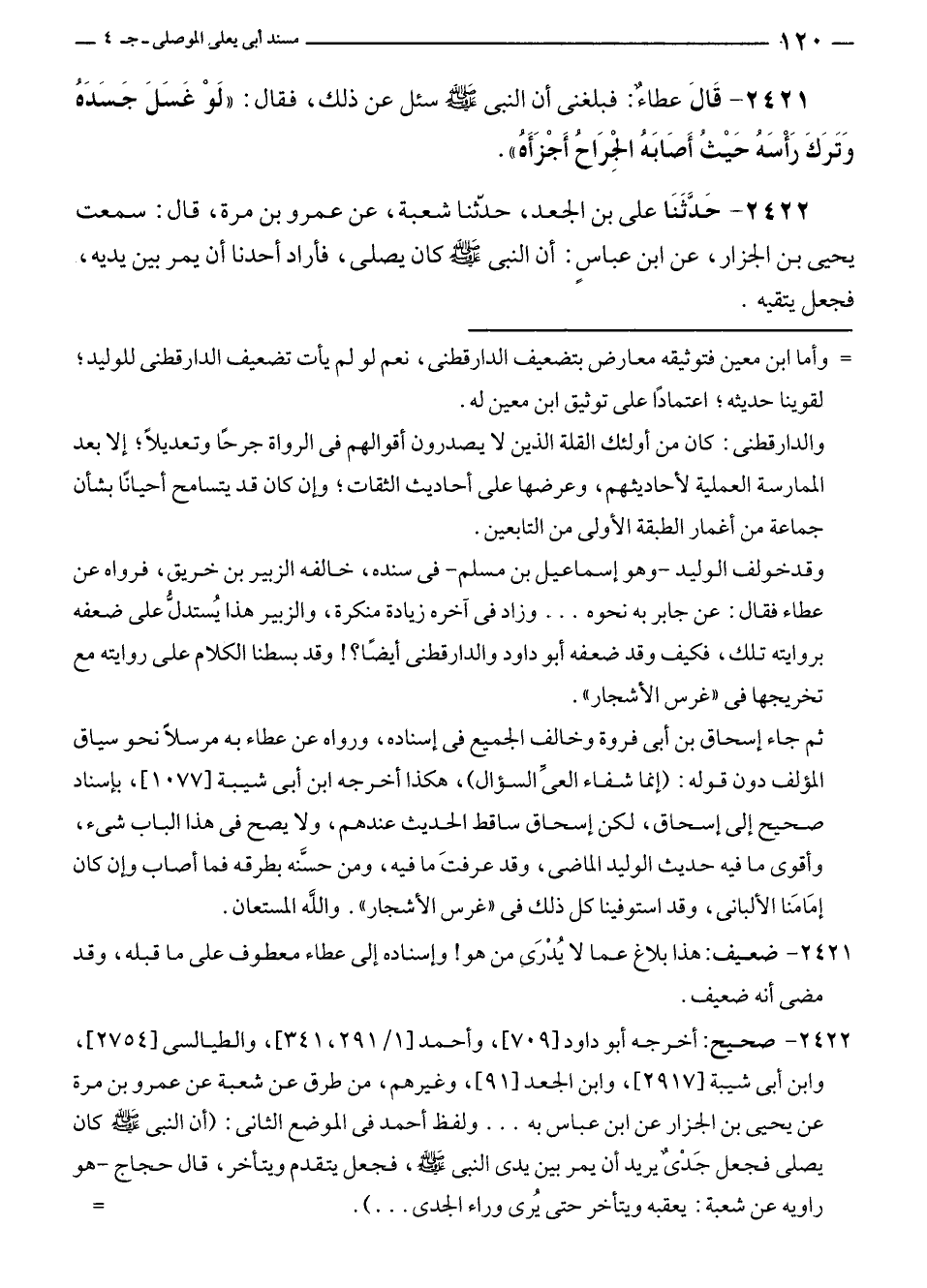 ٢٤٢١ - قَالَ عطاءٌ: فبلغنى أن النبي - صلى الله عليه وسلم - سئل عن ذلك، فقال: "لَوْ غَسَلَ جَسَدَهُ وَتَرَكَ رَأْسَهُ حَيْثُ أَصَابَهُ الْجِرَاحُ أَجْزَأَهُ".