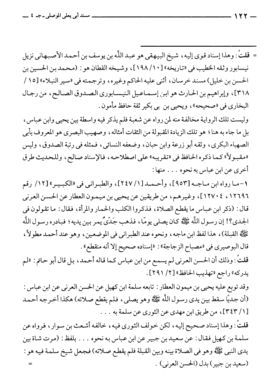 قلتُ: وذلك أن الحسن العرنى لم يسمع من ابن عباس كما قاله أحمد، بل قال أبو حاتم: "لم يدركه" راجع "تهذيب الحافظ" [٢/ ٢٩١].