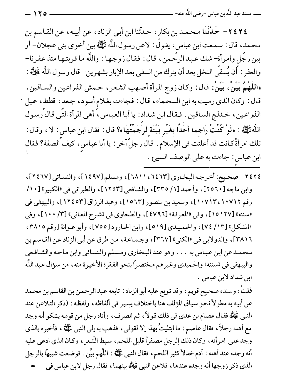 ٢٤٢٤ - حَدَّثَنَا محمد بن بكارٍ، حدّثنا ابن أبى الزناد، عن أبيه، عن القاسم بن محمدٍ، قال: سمعت ابن عباسٍ، يقول: لاعن رسول الله - صلى الله عليه وسلم - بين أخوى بنى عجلان - أو بين رجلٍ وامرأةٍ - شك عبد الرحمن، قال: فقال زوجها: والله ما قربتها منذ عفرنا - والعفر: أن يُسقى النخل بعد أن يترك من السقى بعد الإبار بشهرين - قال رسول - صلى الله عليه وسلم -: "اللَّهُمَّ بَيِّنْ، بَيِّنْ" قال: وكان زوج المرأة أصهب الشعر، حمش الذراعين والساقين، قال: وكان الذي رميت به ابن السحماء، قال: فجاءت بغلامٍ أسود، جعدٍ، قططٍ، عبل الذراعين، خدلج الساقين. فقال ابن شداد: يا أبا العباس، أهى المرأة التى قال رسول الله - صلى الله عليه وسلم -: "لَوْ كُنْتُ رَاجِمًا أَحَدًا بِغَيْرِ بَيِّنَةٍ لَرَجَمْتُهَا"؟ قال: فقال ابن عباسٍ: لا، وقال: تلك امرأةٌ كانت قد أعلنت في الإسلام. قال رجل آخر: يا أبا عباس، كيف الصفة؟ فقال ابن عباسٍ: جاءت به على الوصف السيئ.