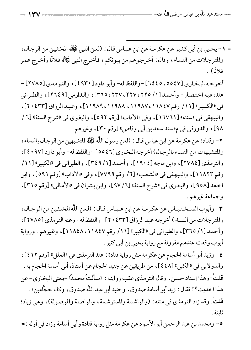 ٣ - وأيوب السختيانى عن عكرمة عن ابن عباس قال: (لعن الله المخنثين من الرجال، والمترجلات من النساء) أخرجه عبد الرزاق [٢٠٤٣٣]- واللفظ له - وعنه الترمذى [٢٧٨٥]، وأحمد [١/ ٣٦٥]، والطبرانى في "الكبير" [١١/ رقم ١١٨٤٧، ١١٨٤٨]، وغيرهم. ورواية أيوب وقعت عندهم مقرونة مع رواية يحيى بن أبى كثير.