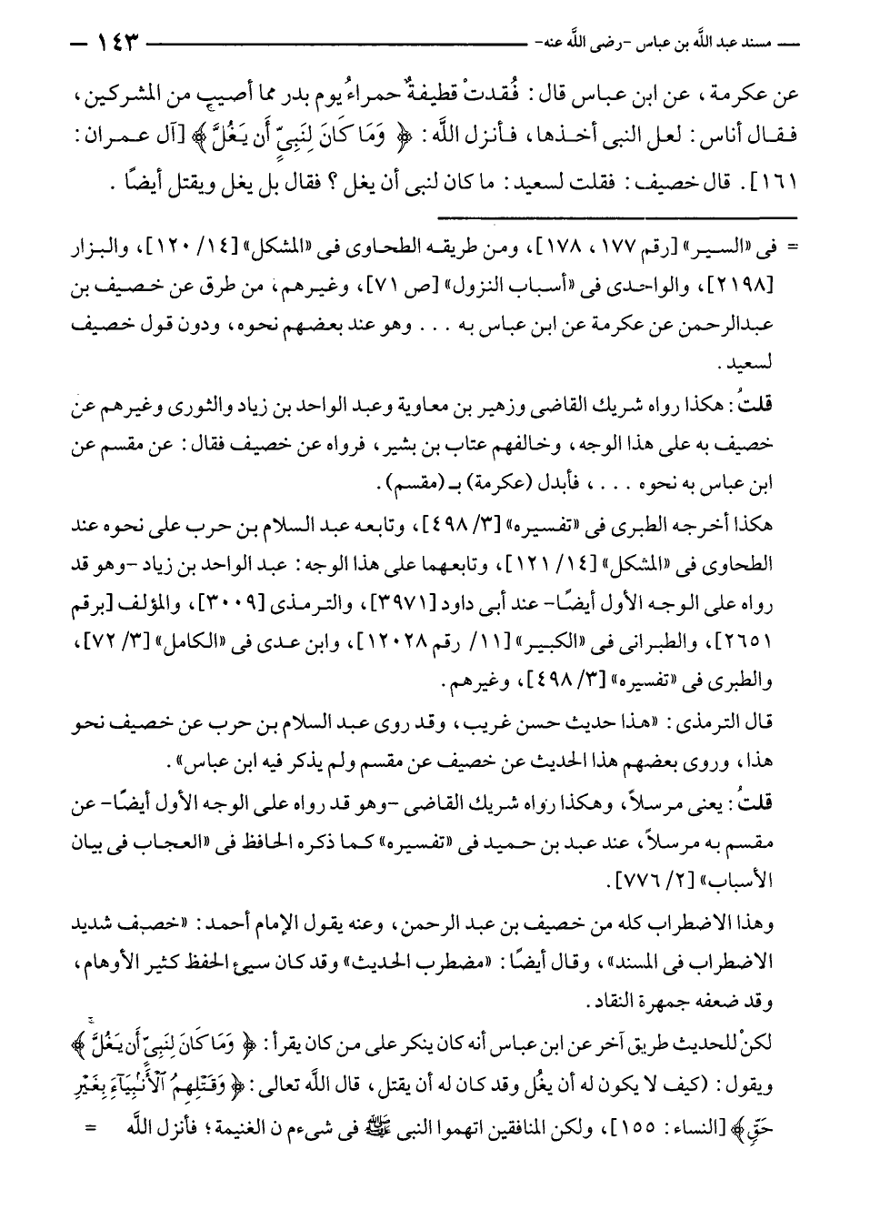 لكن للحديث طريق آخر عن ابن عباس أنه كان ينكر على من كان يقرأ: {وَمَا كَانَ لِنَبِيٍّ أَنْ يَغُلَّ} ويقول: (كيف لا يكون له أن يغُل وقد كان له أن يقتل، قال الله تعالى: {وَقَتْلِهِمُ الْأَنْبِيَاءَ بِغَيْرِ حَقٍّ} [النساء: ١٥٥]، ولكن المنافقين اتهموا النبي - صلى الله عليه وسلم - في شئ من الغنيمة؛ فأنزل الله =