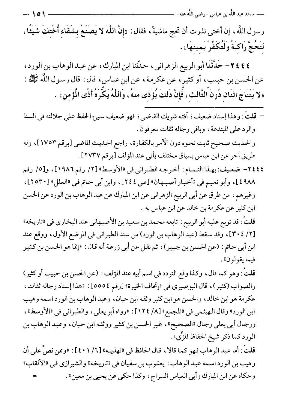 ٢٤٤٤ - حَدَّثَنَا أبو الربيع الزهرانى، حدّثنا ابن المبارك، عن عبد الوهاب بن الورد، عن الحسن بن حبيبٍ، أو كثيرٍ، عن عكرمة، عن ابن عباسٍ، قال: قال رسول الله - صلى الله عليه وسلم -: "لا يَتَنَاجَ اثْنَانِ دُونَ الثَّالِثِ، فَإِنَّ ذَلِكَ يُؤْذِى مِنْهُ، وَاللهُ يَكرَهُ أَذًى المؤْمِنِ".