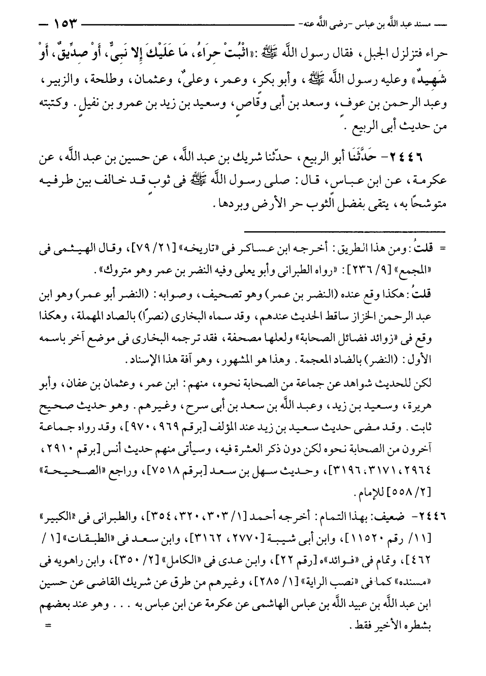 ٢٤٤٦ - حَدَّثَنَا أبو الربيع، حدّثنا شريك بن عبد الله، عن حسين بن عبد الله، عن عكرمة، عن ابن عباسٍ، قال: صلى رسول الله - صلى الله عليه وسلم - في ثوبٍ قد خالف بين طرفيه متوشحًا به، يتقى يفضل الثوب حر الأرض وبردها.