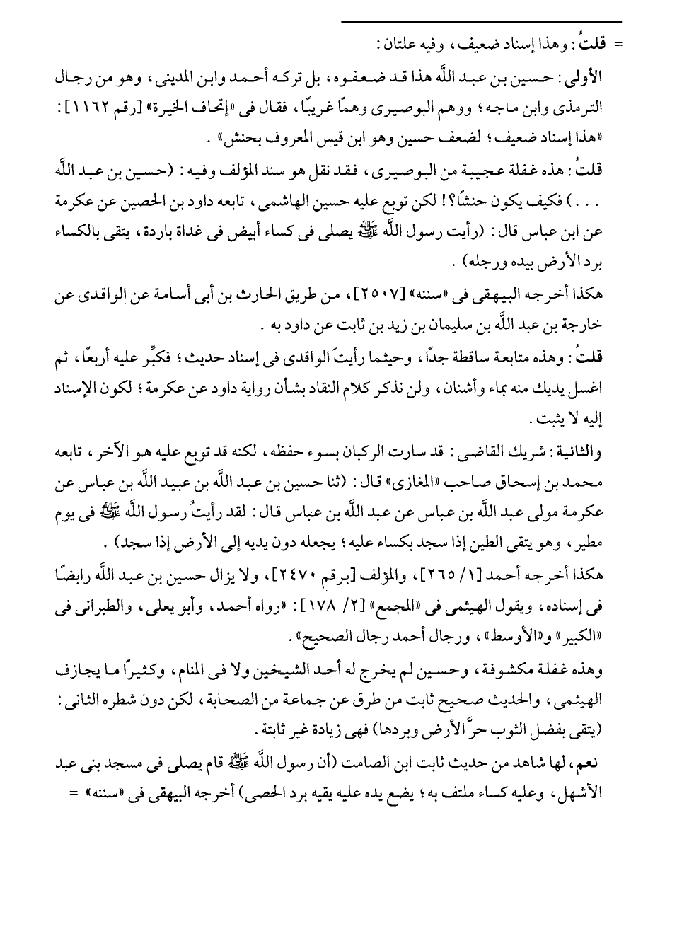 قلتُ: هذه غفلة عجيبة من البوصيرى، فقد نقل هو سند المؤلف وفيه: (حسين بن عبد الله ... ) فكيف يكون حنشًا؟! لكن توبع عليه حسين الهاشمى، تابعه داود بن الحصين عن عكرمة عن ابن عباس قال: (رأيت رسول الله - صلى الله عليه وسلم - يصلى في كساء أبيض في غداة باردة، يتقى بالكساء برد الأرض بيده ورجله).