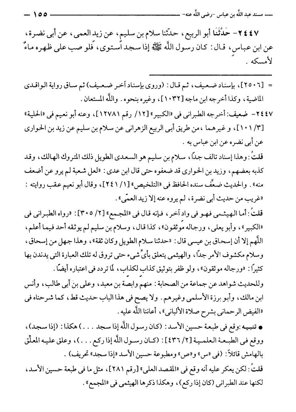 ٢٤٤٧ - حَدَّثَنَا أبو الربيع، حدّثنا سلام بن سليمٍ، عن زيدٍ العمى، عن أبى نضرة، عن ابن عباسٍ، قال: كان رسول الله - صلى الله عليه وسلم - إذا سجد استوى، فلو صب على ظهره ماءٌ لأمسكه.