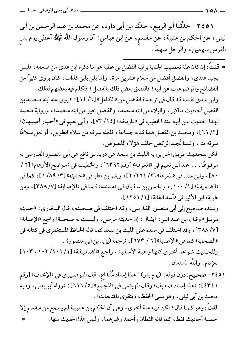 ٢٤٥١ - حَدَّثَنَا أبو الربيع، حدّثنا ابن أبى داود، عن محمد بن عبد الرحمن بن أبى ليلى، عن الحكم بن عتيبة، عن مقسمٍ، عن ابن عباسٍ: أن رسول الله - صلى الله عليه وسلم - أعطى يوم بدرٍ الفرس سهمين، والرجل سهمًا.