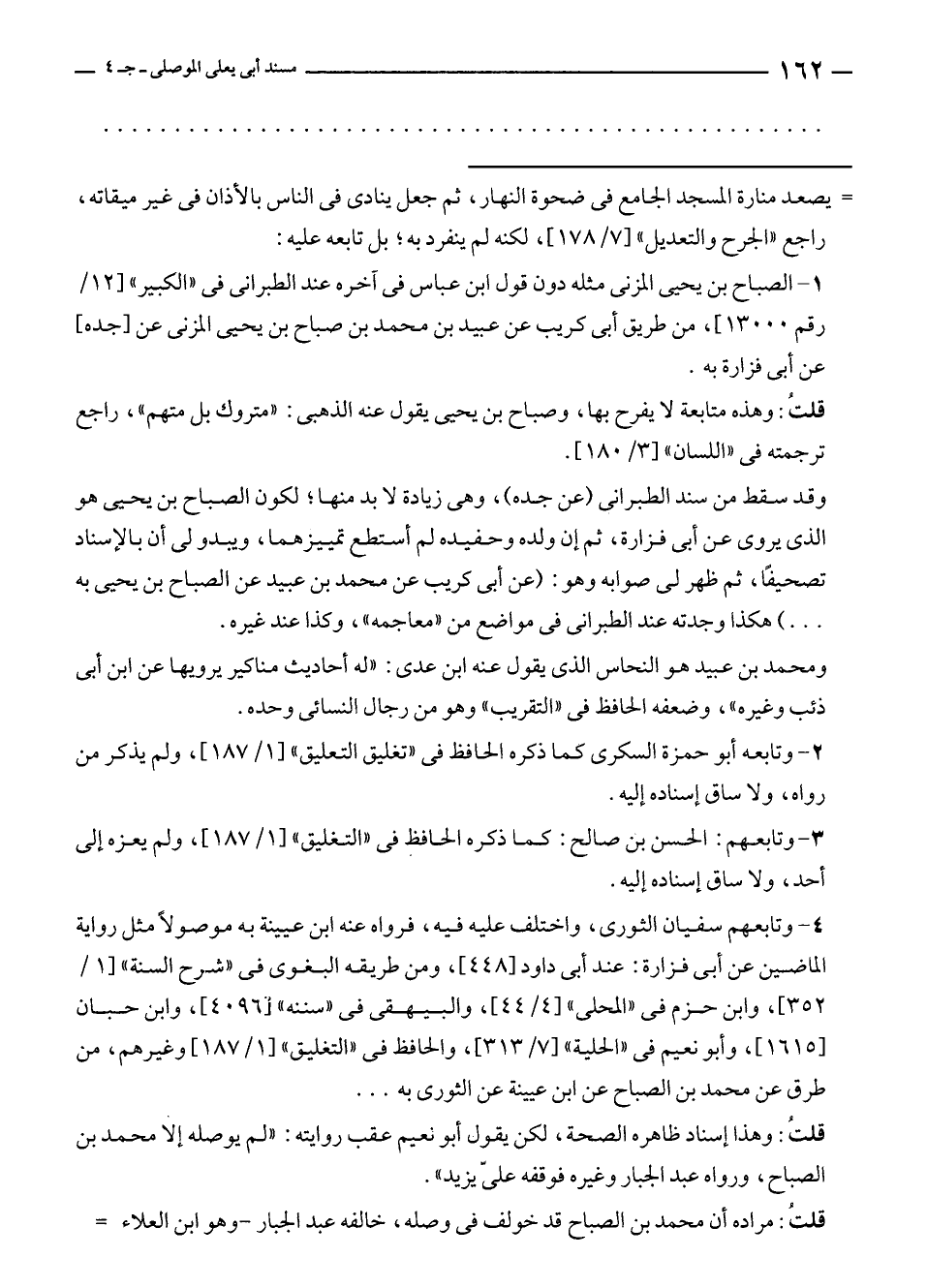 وقد سقط من سند الطبراني (عن جده)، وهى زيادة لا بد منها؛ لكون الصباح بن يحيى هو الذي يروى عن أبى فزارة، ثم إن ولده وحفيده لم أستطع تمييزهما، ويبدو لى أن بالإسناد تصحيفًا، ثم ظهر لى صوابه وهو: (عن أبى كريب عن محمد بن عبيد عن الصباح بن يحيى به ... ) هكذا وجدته عند الطبراني في مواضع من "معاجمه"، وكذا عند غيره.