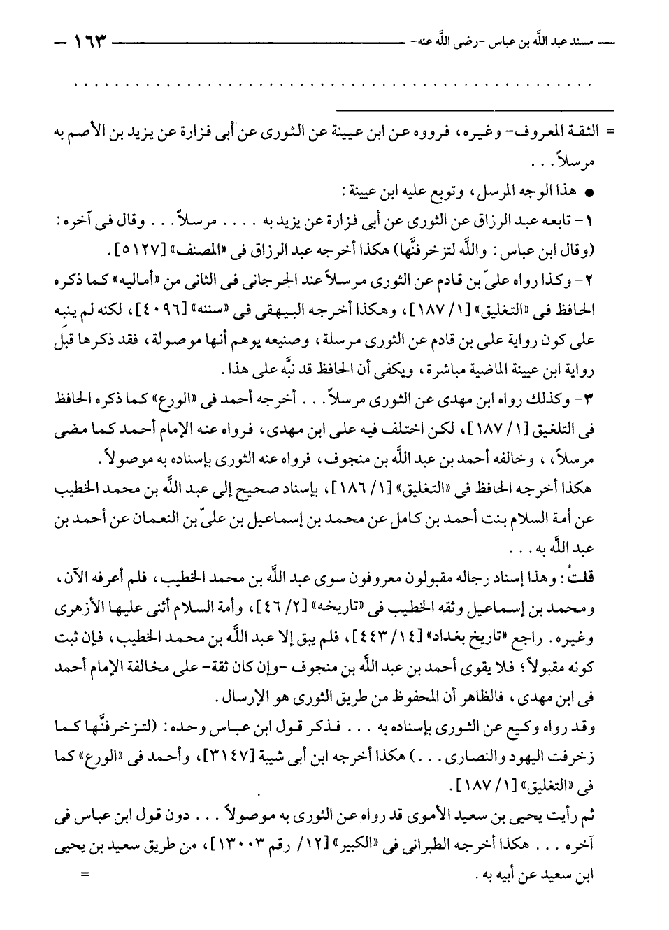 ٣ - وكذلك رواه ابن مهدى عن الثورى مرسلًا ... أخرجه أحمد في "الورع" كما ذكره الحافظ في التلغيق [١/ ١٨٧]، لكن اختلف فيه على ابن مهدى، فرواه عنه الإمام أحمد كما مضى مرسلًا،، وخالفه أحمد بن عبد الله بن منجوف، فرواه عنه الثورى بإسناده به موصولًا.