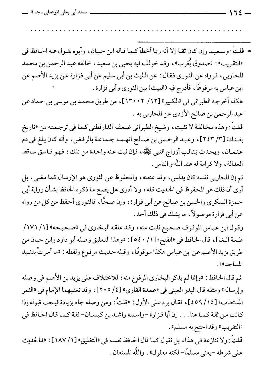 ثم إن المحاربى نفسه كان يدلس، وقد عنعنه، والمحفوظ عن الثورى هو الإرسال كما مضى، بل أرى أن ذلك هو المحفوظ في الحديث كله، ولا أدرى هل يصح ما ذكره الحافظ بشأن رواية أبى حمزة السكرى والحسن بن صالح عن أبى فزارة، وإن صحَّا، فالثورى أحفظ من كل من رواه عن أبى فزارة موصولًا، ما يشك في ذلك أحد.