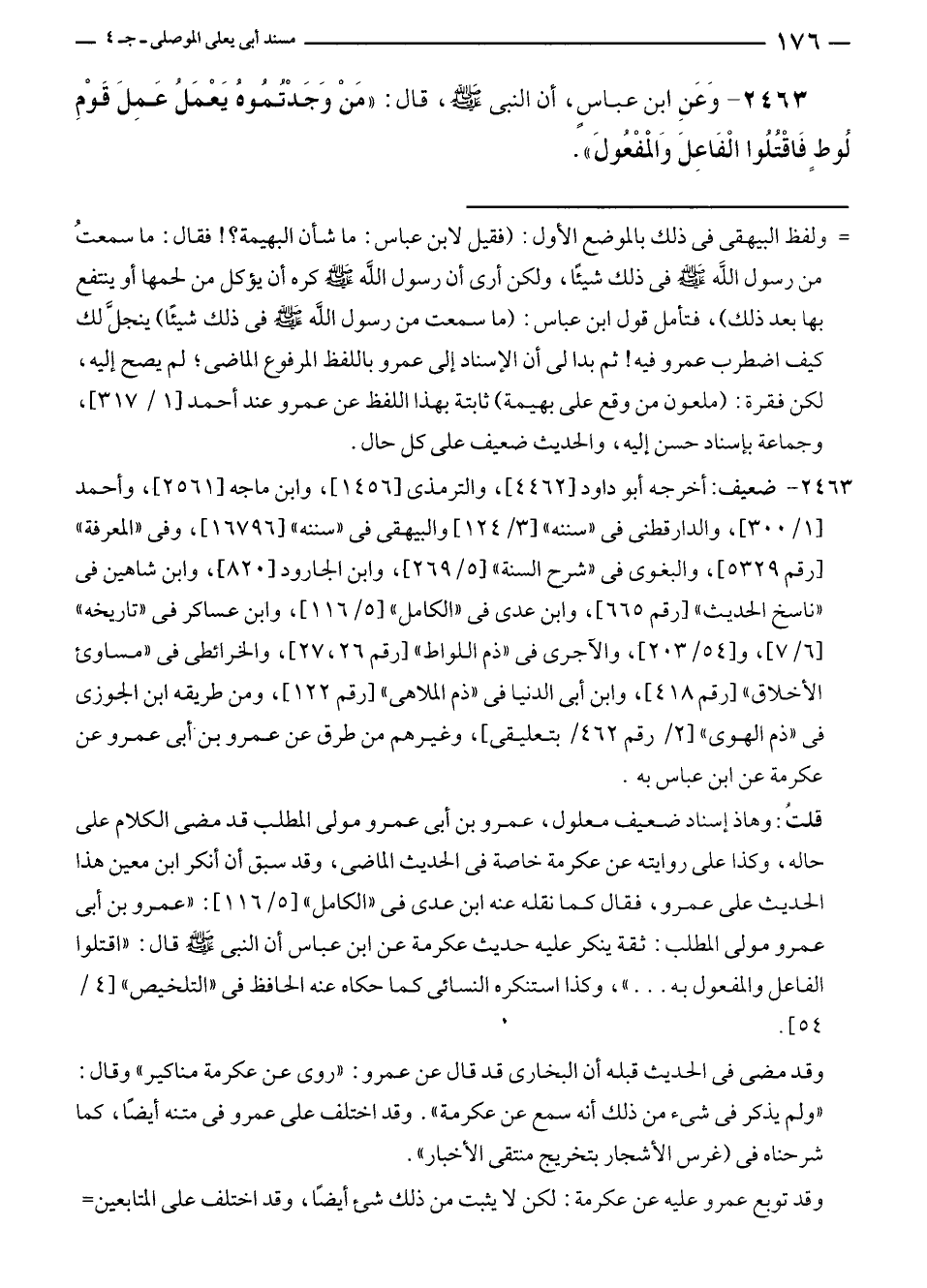 ٢٤٦٣ - ضعيف: أخرجه أبو داود [٤٤٦٢]، والترمذي [١٤٥٦]، وابن ماجه [٢٥٦١]، وأحمد [١/ ٣٠٠]، والدارقطني في "سننه" [٣/ ١٢٤] والبيهقي في "سننه" [١٦٧٩٦]، وفى "المعرفة" [رقم ٥٣٢٩]، والبغوي في "شرح السنة" [٥/ ٢٦٩]، وابن الجارود [٨٢٠]، وابن شاهين في "ناسخ الحديث" [رقم ٦٦٥]، وابن عدى في "الكامل" [٥/ ١١٦]، وابن عساكر في "تاريخه" [٦/ ٧]، و [٥٤/ ٢٠٣]، والآجرى في "ذم اللواط" [رقم ٢٦، ٢٧]، والخرائطي في "مساوئ الأخلاق" [رقم ٤١٨]، وابن أبي الدنيا في "ذم الملاهى" [رقم ١٢٢]، ومن طريقه ابن الجوزى في "ذم الهوى" [٢/ رقم ٤٦٢/ بتعليقى]، وغيرهم من طرق عن عمرو بن أبي عمرو عن عكرمة عن ابن عباس به.