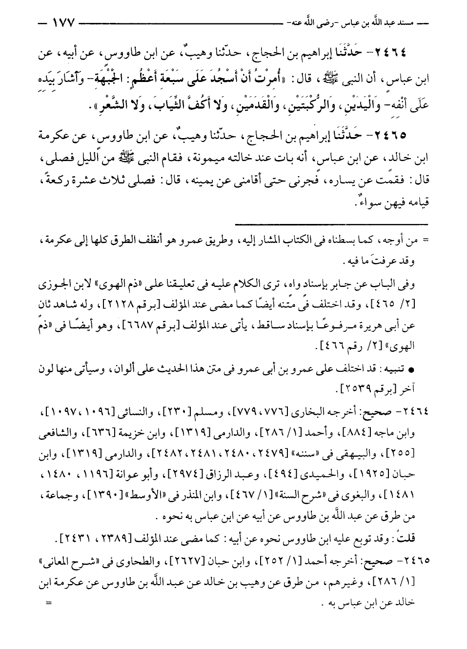 ٢٤٦٤ - حَدَّثَنَا إبراهيم بن الحجاج، حدّثنا وهيبٌ، عن ابن طاووسٍ، عن أبيه، عن ابن عباسٍ، أن النبي - صلى الله عليه وسلم -، قال: "أُمِرْتُ أَنْ أَسجُدَ عَلَى سَبْعَةِ أَعْظُمٍ: الجبْهَةِ - وأشَارَ بِيَدِهِ عَلَى أنْفِهِ - وَالْيَدَيْنِ، وَالرُّكْبَتَيْنِ، وَالْقدَمَيْنِ، وَلا أَكُفَّ الثِّيَابَ، وَلا الشَّعْرِ".