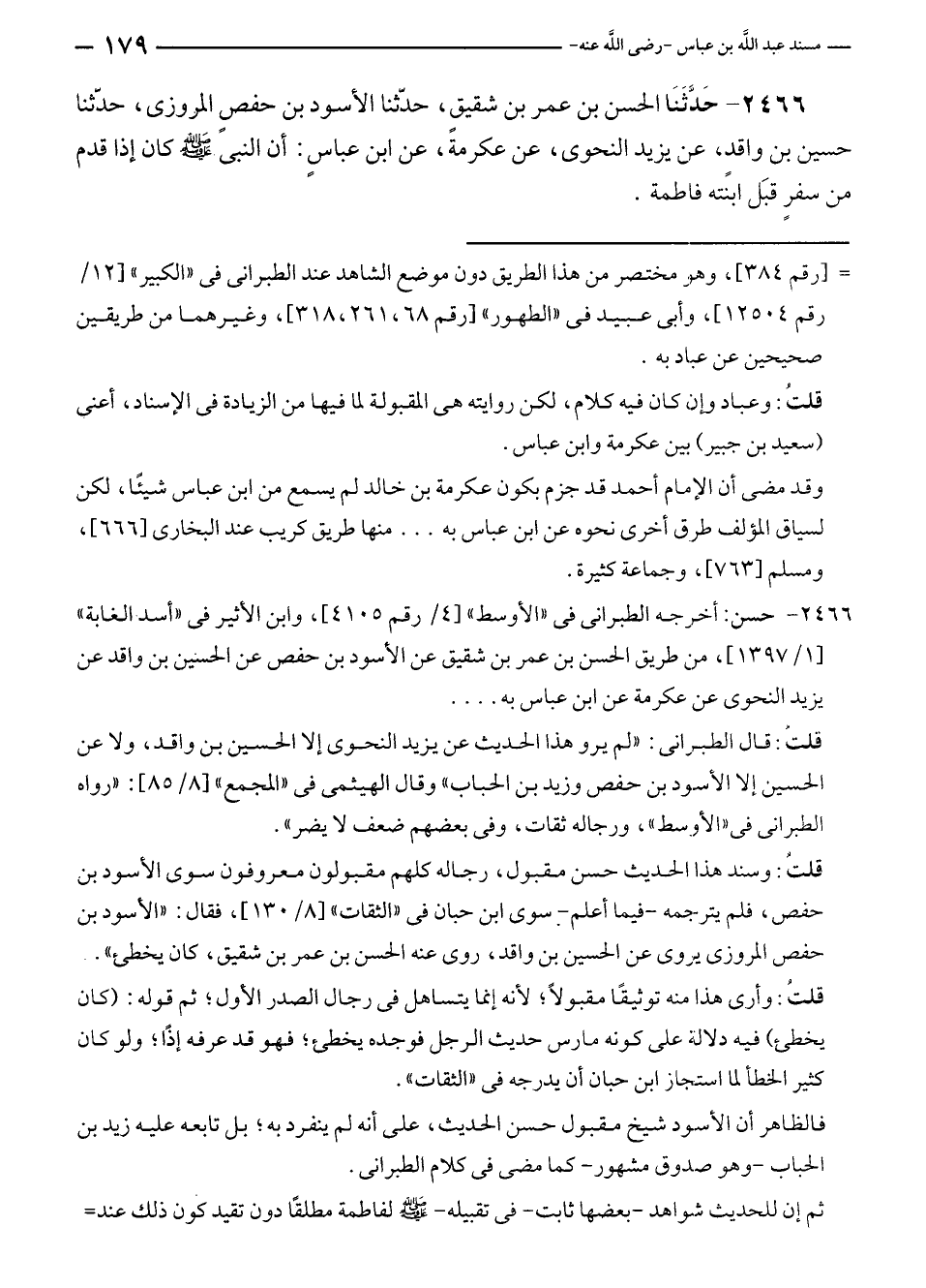 ٢٤٦٦ - حَدَّثَنَا الحسن بن عمر بن شقيقٍ، حدّثنا الأسود بن حفصٍ المروزى، حدّثنا حسين بن واقدٍ، عن يزيد النحوى، عن عكرمة، عن ابن عباسٍ: أن النبي - صلى الله عليه وسلم - كان إذا قدم من سفرٍ قبل ابنته فاطمة.