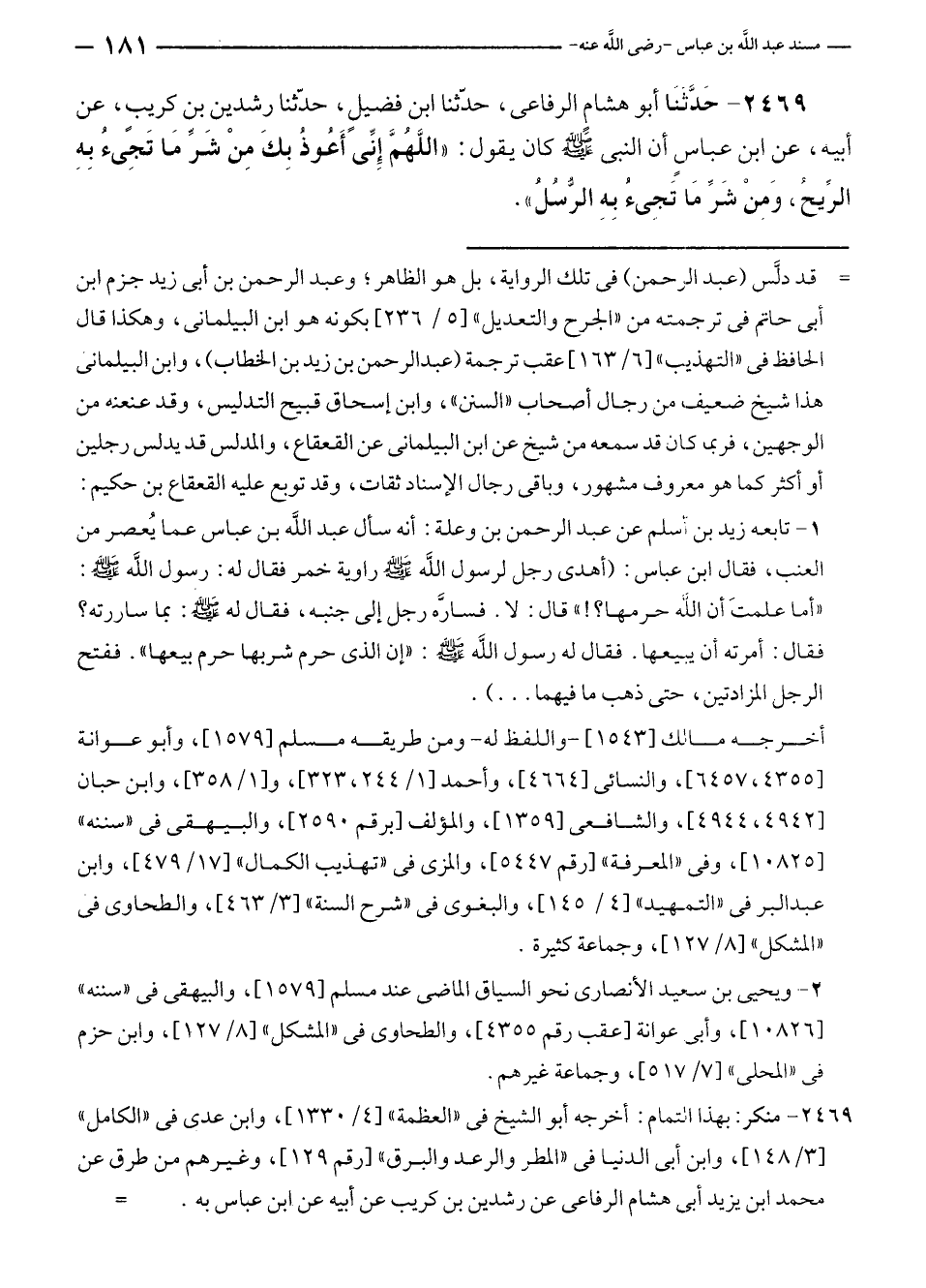 ٢٤٦٩ - حَدَّثنَا أبو هشام الرفاعى، حدّثنا ابن فضيلِ، حدّثنا رشدين بن كريب، عن أبيه، عن ابن عباسٍ أن النبي - صلى الله عليه وسلم - كان يقول: "اللَّهُمَّ إِنَّىَ أَعُوذُ بِكَ مِنْ شَرِّ مَا تَجِئُ بِهِ الرِّيحَ، وَمن شَرِّ مَا تَجئُ بِهِ الرُّسُلُ".