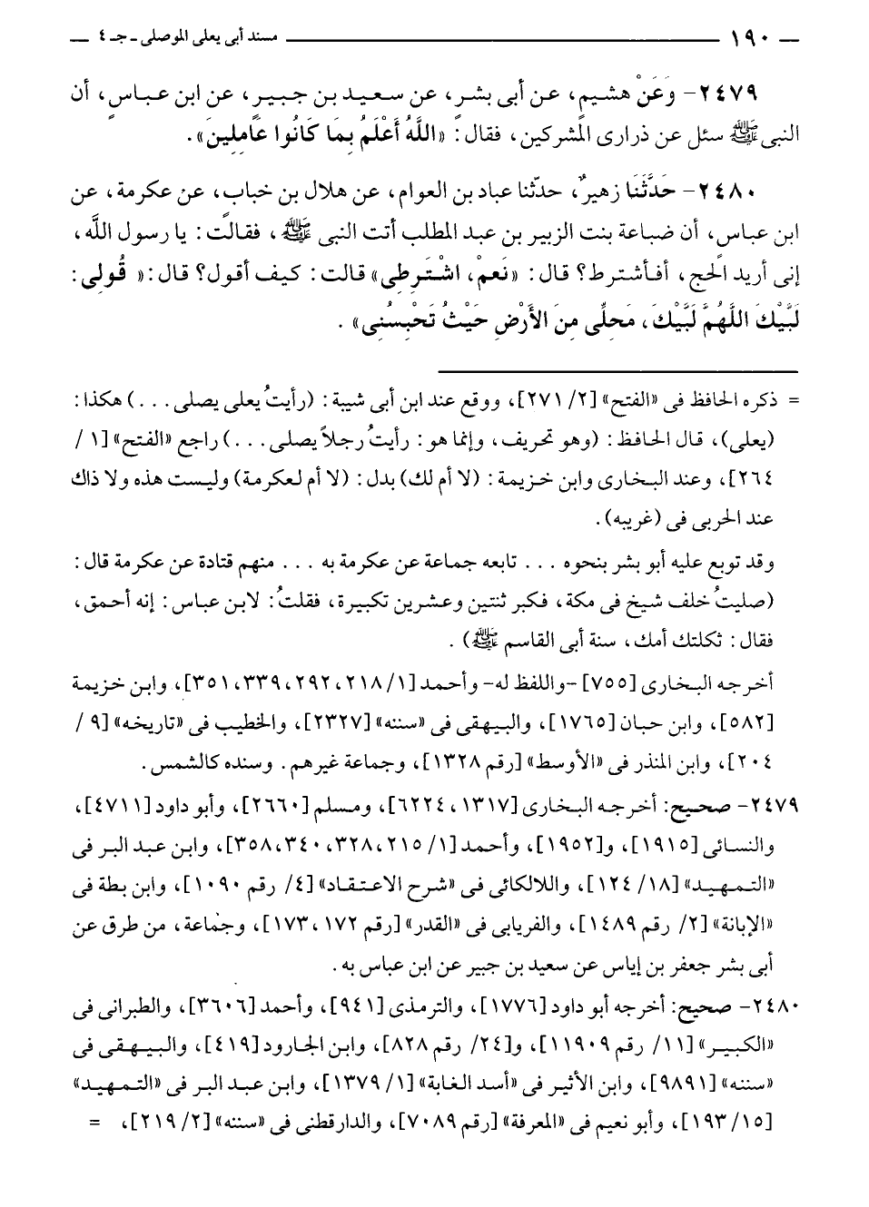 ٢٤٨٠ - حَدَّثَنَا زهيرٌ، حدّثنا عباد بن العوام، عن هلال بن خباب، عن عكرمة، عن ابن عباسٍ، أن ضباعة بنت الزبير بن عبد المطلب أتت النبي - صلى الله عليه وسلم -، فقالتُ: يا رسول الله، إنى أريد الحج، أفأشترط؟ قال: "نَعمْ، اشْتَرِطِى" قالت: كيف أقول؟ قال: "قُولِى: لبَّيْكَ اللَّهُمَّ لَبَّيْكَ، مَحِلِّى مِنَ الأَرْضِ حَيْثُ تَحْبِسُنِى".