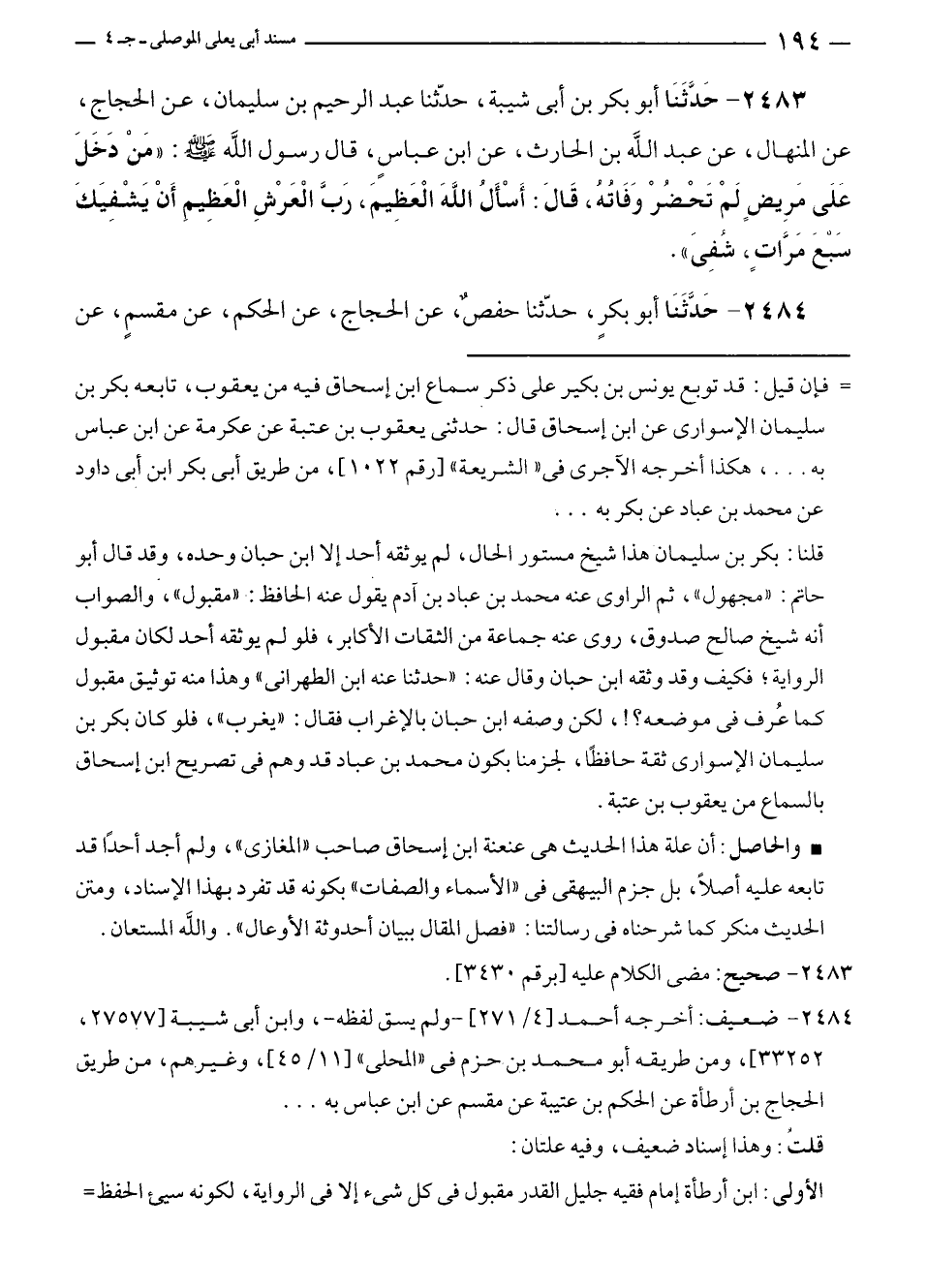 ٢٤٨٣ - حَدَّثَنَا أبو بكر بن أبي شيبة، حدّثنا عبد الرحيم بن سليمان، عن الحجاج، عن المنهال، عن عبد الله بن الحارث، عن ابن عباسٍ، قال رسول الله - صلى الله عليه وسلم -: "مَنْ دَخَلَ عَلَى مَرِيضٍ لَمْ تَحْضُرْ وَفَاتُهُ، قَالَ: أَسْأَلُ اللَّهَ الْعَظِيمَ، رَبَّ الْعَرْشِ الْعَظِيمِ أَنْ يَشْفِيَكَ سَبعَ مَرَّاتٍ، شُفِىَ".