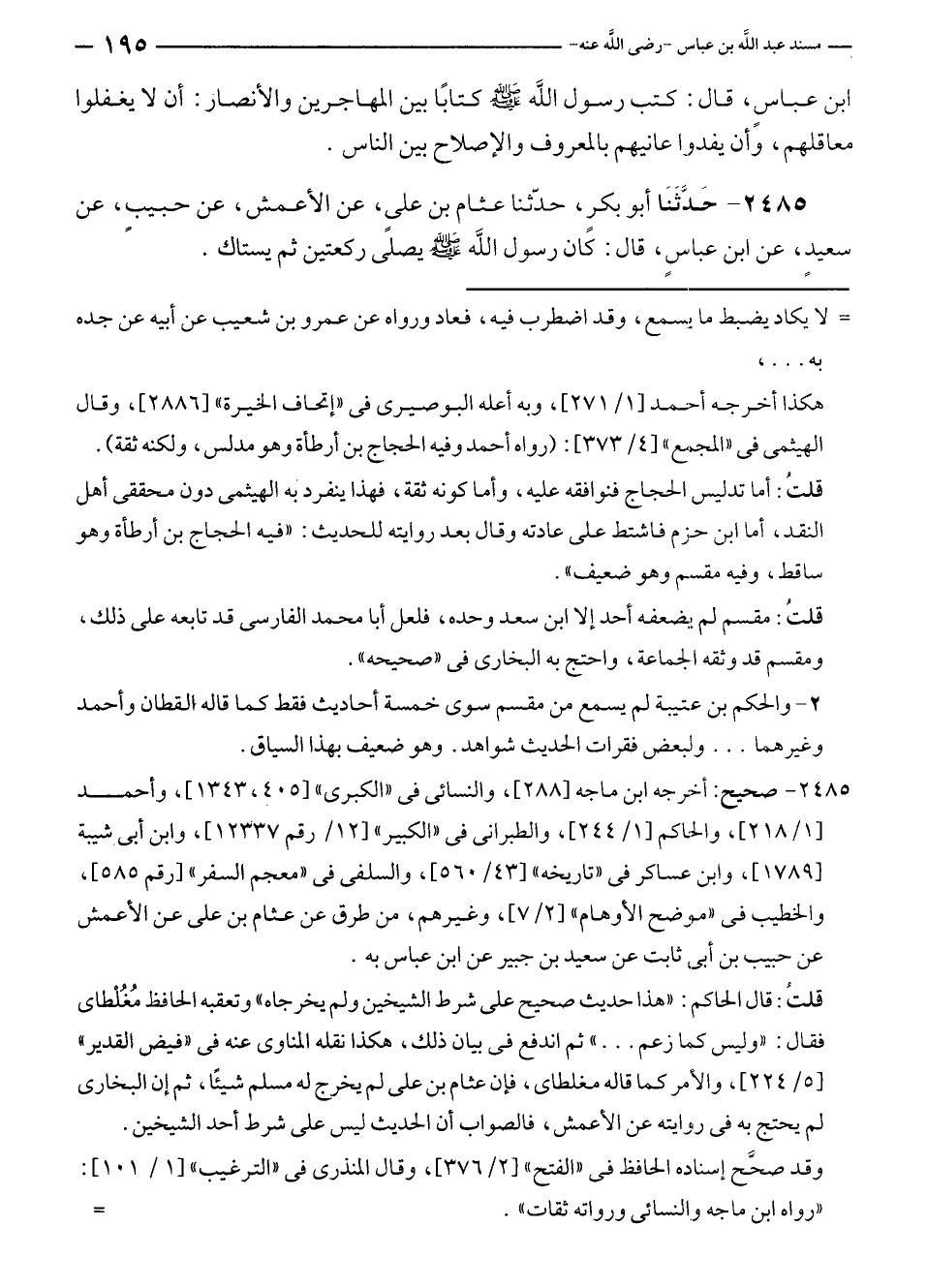 ٢٤٨٥ - صحيح: أخرجه ابن ماجه [٢٨٨]، والنسائي في "الكبرى" [٤٠٥، ١٣٤٣]، وأحمد [١/ ٢١٨]، والحاكم [١/ ٢٤٤]، والطبراني في "الكبير" [١٢/ رقم ١٢٣٣٧]، وابن أبي شيبة [١٧٨٩]، وابن عساكر في "تاريخه" [٤٣/ ٥٦٠]، والسلفى في "معجم السفر" [رقم ٥٨٥]، والخطيب في "موضح الأوهام" [٢/ ٧]، وغيرهم، من طرق عن عثام بن على عن الأعمش عن حبيب بن أبي ثابت عن سعيد بن جبير عن ابن عباس به.