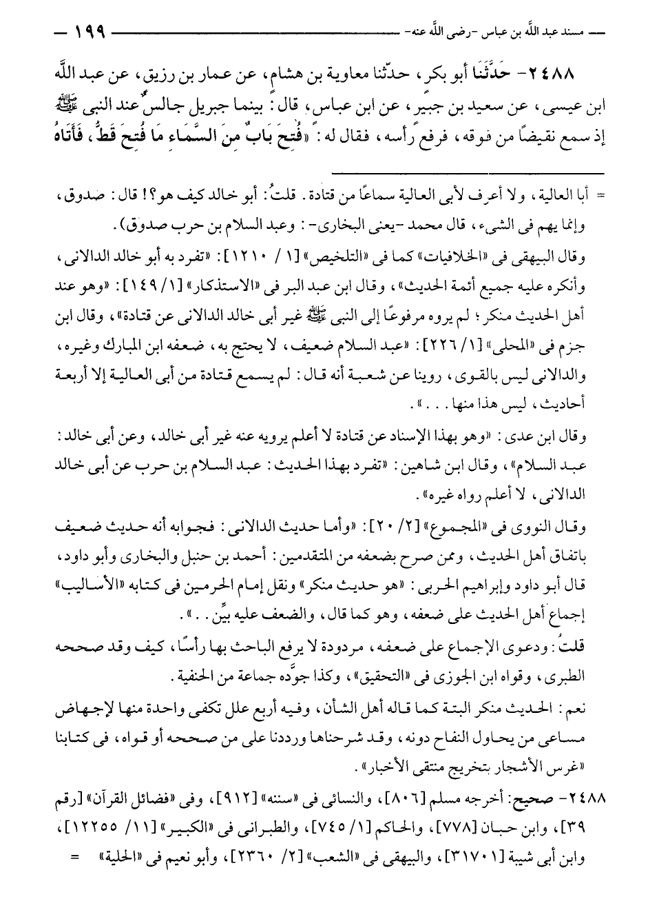 ٢٤٨٨ - حَدَّثَنَا أبو بكرٍ، حدّثنا معاوية بن هشامٍ، عن عمار بن رزيق، عن عبد الله بن عيسى، عن سعيد بن جبيرٍ، عن ابن عباسٍ، قال: بينما جبريل جالسٌ عند النبي - صلى الله عليه وسلم - إذ سمع نقيضًا من دوقه، فرفع رأسه، فقال له: "فُتِحَ بَابٌ مِنَ السَّمَاءِ مَا فتِحَ قَطُّ، فَأَتَاهُ