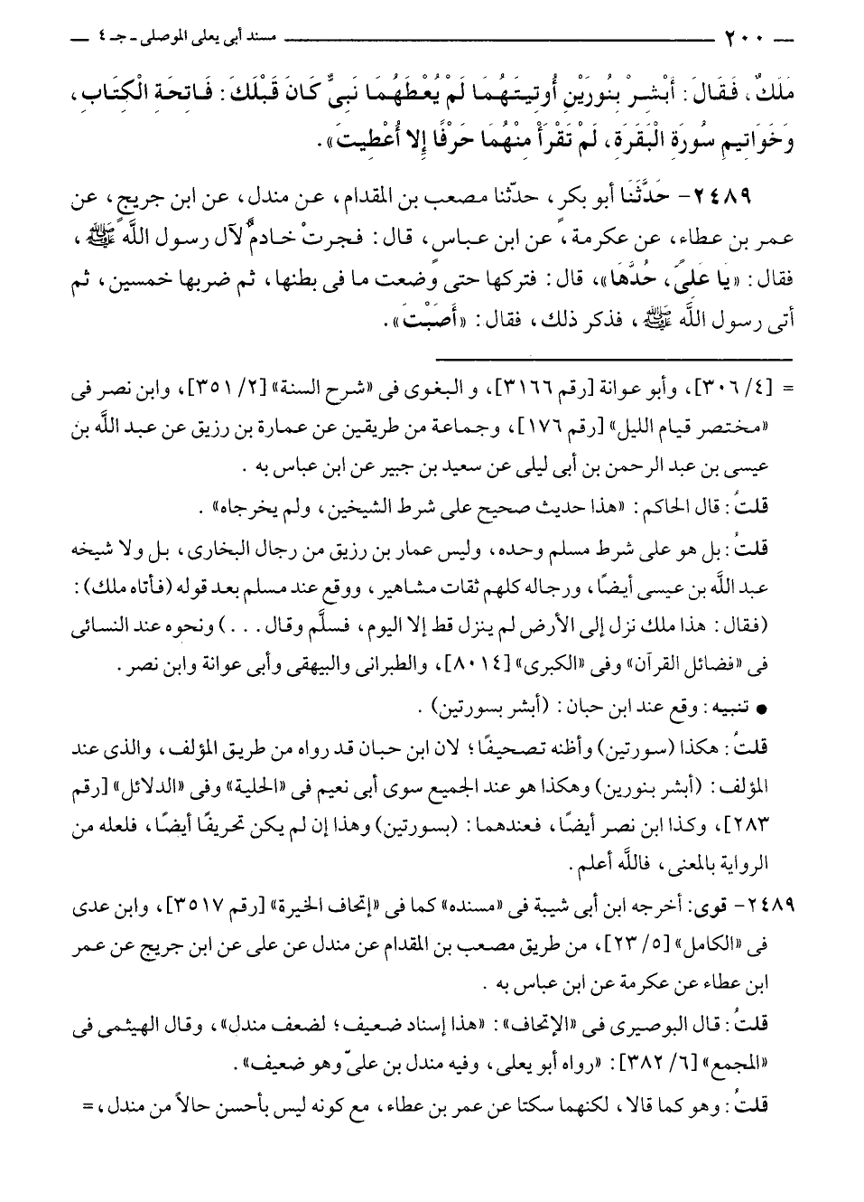 قلتُ: قال البوصيري في "الإتحاف": "هذا إسناد ضعيف؛ لضعف مندل"، وقال الهيثمي في "المجمع" [٦/ ٣٨٢]: "رواه أبو يعلى، وفيه مندل بن عليّ وهو ضعيف".